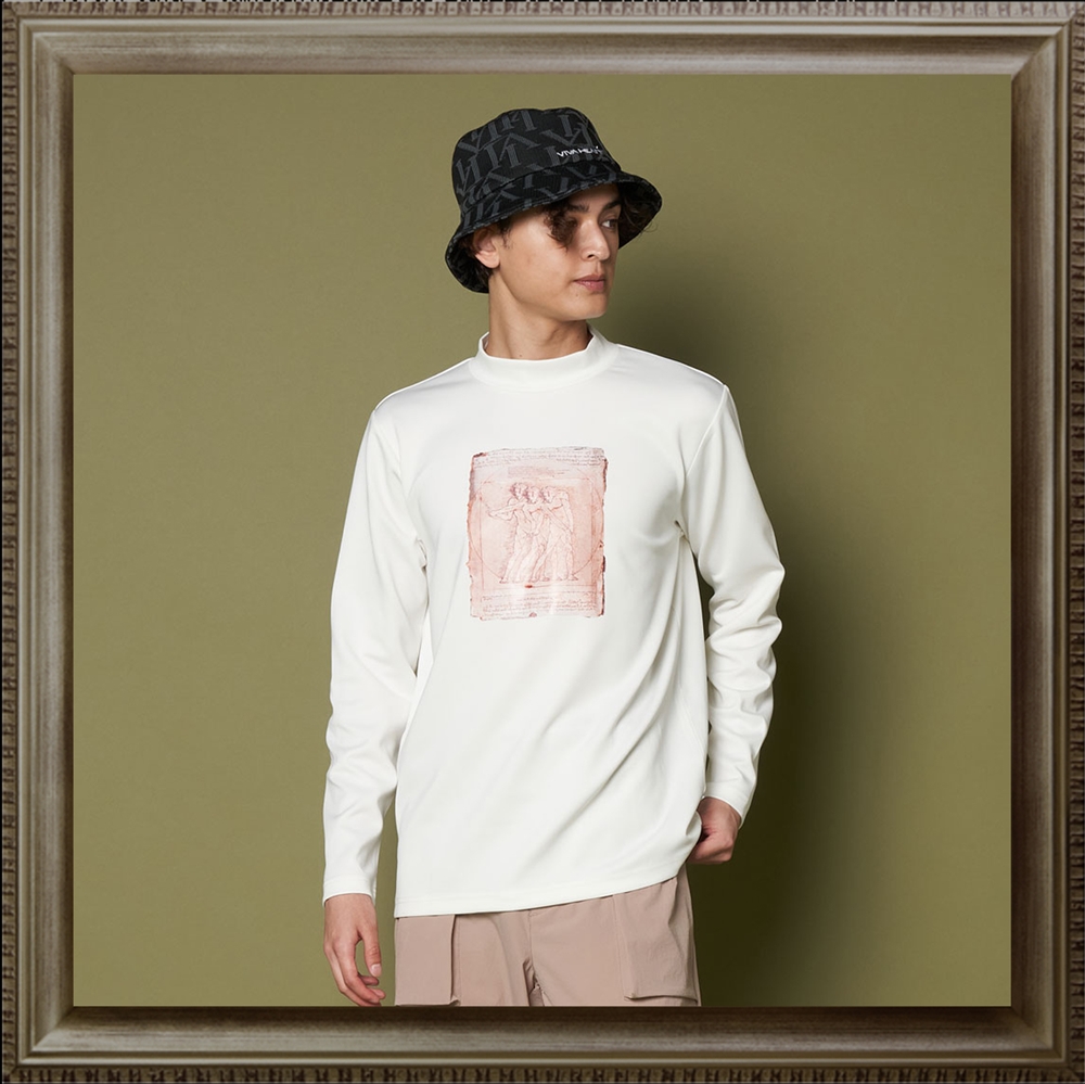 「着る美術館」をテーマにミュージアムピースをセレクト。誰もが知る名画がプリントされた長袖モック。ストレッチ性が高く動きやすいスムース素材です。ダヴィンチの人体図をモチーフとした絵画は、ゴルフのフォームを入れ込んだ遊び心あるデザイン。