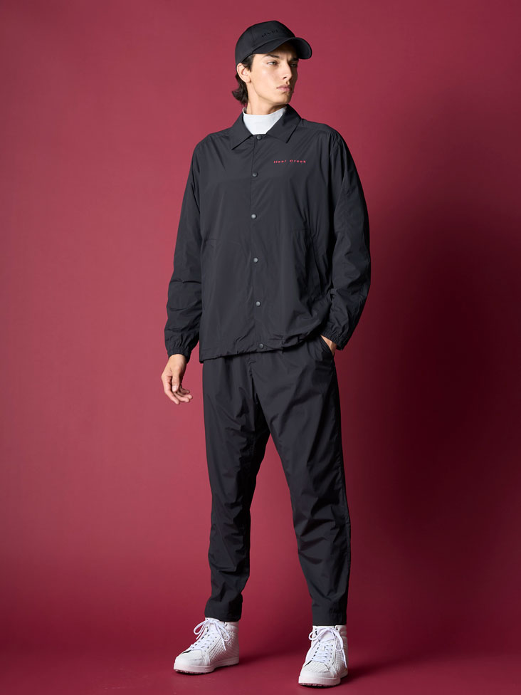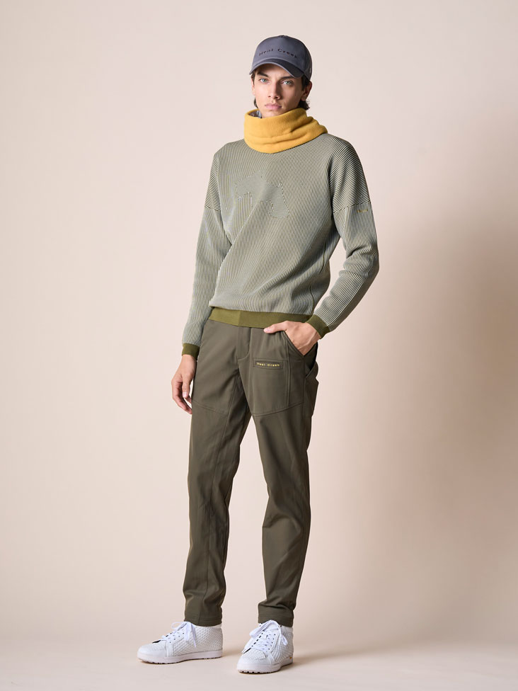 横田プロ着用コメント「この新作シャーリングパンツは、とにかく軽くて本当に快適です。裏地のメッシュが汗をかいてもサラッとした着心地を保ってくれます。 テーパードシルエットのおかげで脚がすっきり見えて、ラウンド後にそのまま街に出ても違和感なし。 上質なゴルフスタイルを求める大人の男性に、ぜひ試してほしい一本ですね。」