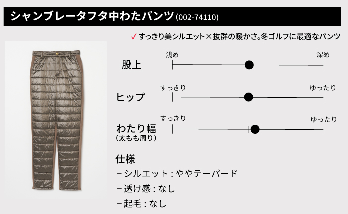 冷え込みが増す初冬から冬のラウンドには、防風性や保温性に優れたパンツがおすすめです。