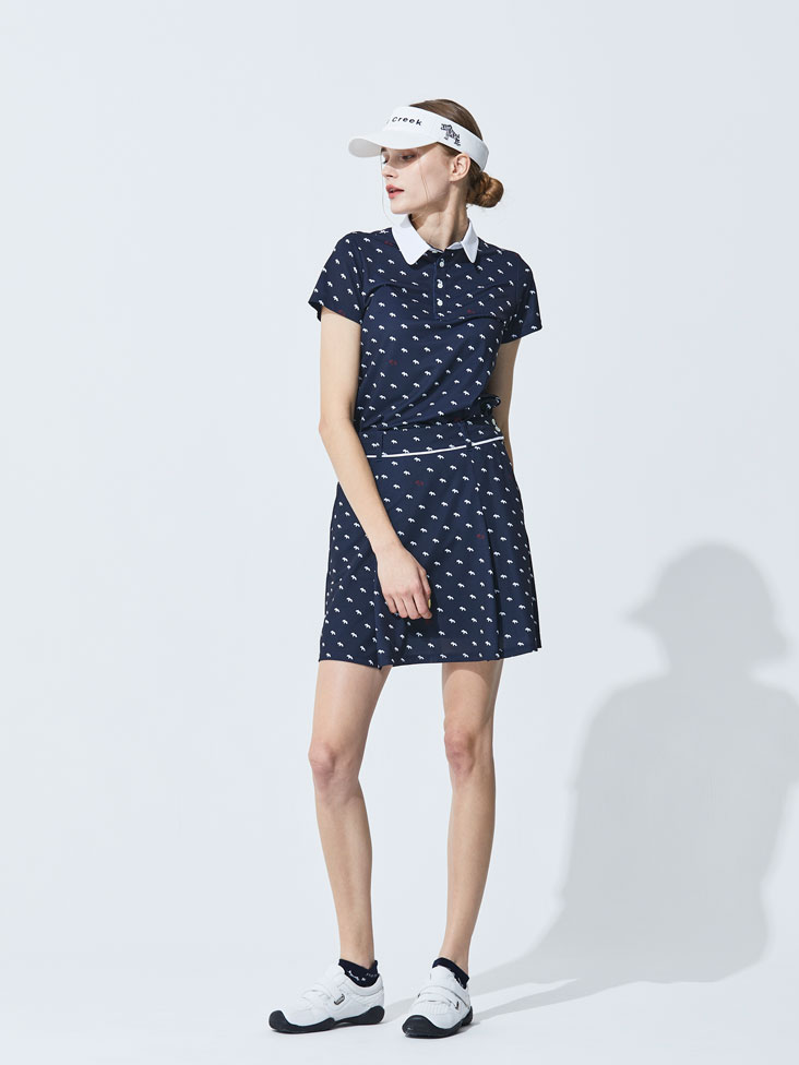 一見水玉模様に見えるプリントは、アイコンのヘンリーで出来ています。白い衿を効かせたシャツとお揃いのタックスカートを合わせて、ワンピースのように着こなした清楚なルックスです。素材はサラサラとした肌触りで落ち感のある薄手の鹿の子素材を使用しており、真夏まで快適に着用出来ます。 小物も白でまとめて爽やかに。