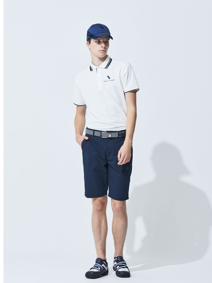 ホワイト×ネイビーは王道のカラーリングですが、エレガントで洗練された印象を与えます。清潔感と共に、上品さを感じさせるコーディネートとなっております。若々しいハーフパンツとの相性も抜群で、夏のプレーを快適に楽しむことができます。
