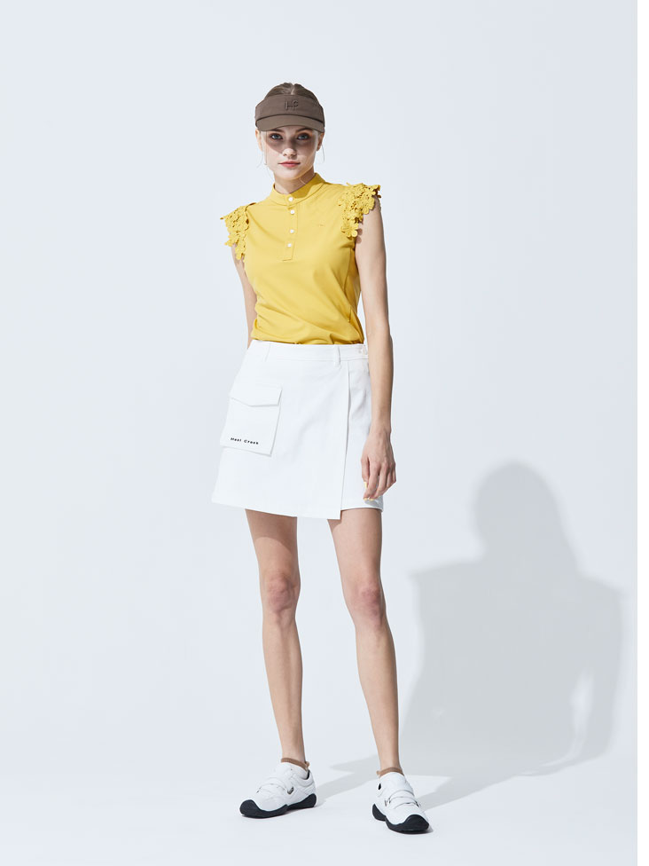 肩先を包み込むレースがパッと目を引く華やかなイエローのトップスは、この夏一押しのアイテムです。辛口なバンドカラーがレースの甘さを抑えて絶妙なバランスになっています。ヒールクリークならではのスポーティエレガンスを体現した1着です。 合わせるボトムスにはラップスカート風のショートパンツをチョイス。綿麻混のナチュラルな見え方が上品で、華やかなトップスを引き立てます。 グログランのサンバイザーにブラウンを選べばシックさも加わります。 仕上げにはレースのティーホルダーをプラス。 ゴルフ小物にはめずらしいレースのアレンジが魅力ですが、実は、様々な形状のティーやグリーンフォークを差し込める点が優れものです。