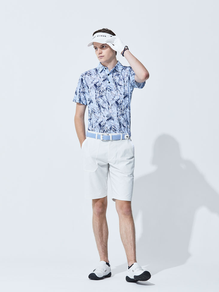 涼しさと上品さを演出する、サックスとホワイトの素敵なコーディネートが特長のアイテムです。透けにくいホワイトのハーフパンツは快適な着心地が自慢で、高品質な素材を使用しています。夏らしいメッシュベルトも加わり、洗練された大人のスタイリングが可能です。上質な印象を持つファッションアイテムとしておすすめです。