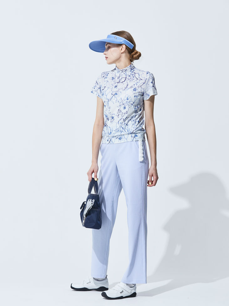 人気の白地の花柄プリントにシアサッカーのパンツを合わせた清涼感あふれる組み合わせ。 夏の定番素材であるコンチェロポリエステルを使用した上品な花柄のモックネックプルオーバーを作りました。裾を出してブラウジングして着こなせるゆったり目のシルエットが、夏に嬉しいデザインです。パネルラインにはシアサッカーストライプを挟み込みアクセントにしています。 同じシアサッカーのパンツを合わせれば涼し気なセットアップが完成します。左脇あきに並んだ白い釦も涼し気なアクセントになった、気負わずに履けるワイドストレートなシルエットです。小物もブルー系でまとめて爽やかな印象に。