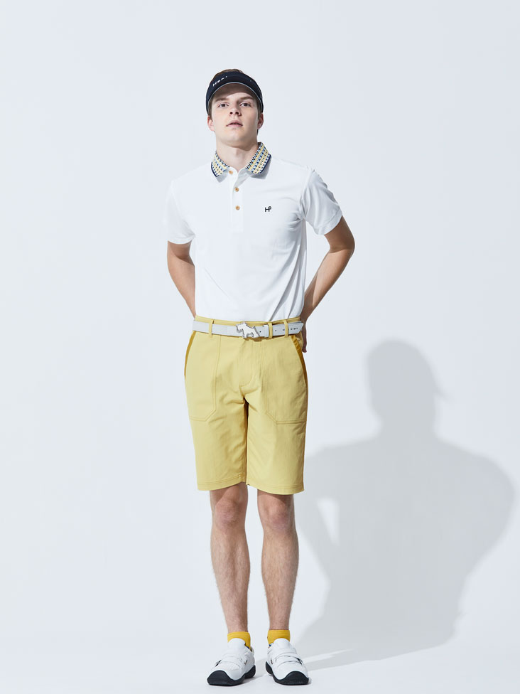 シャイニーなイエローのハーフパンツは、夏の日差しを受けて輝く素敵なアイテムです。吸汗速乾機能が付いたエスニック調のジャガード衿が特徴的なシャツと相性抜群のソックスと組み合わせることで、快適で洗練されたスタイルを演出できます。また、ヘンリー君のバックル付きベルトを着用することで、より充実感のあるプレーが可能になるでしょう。