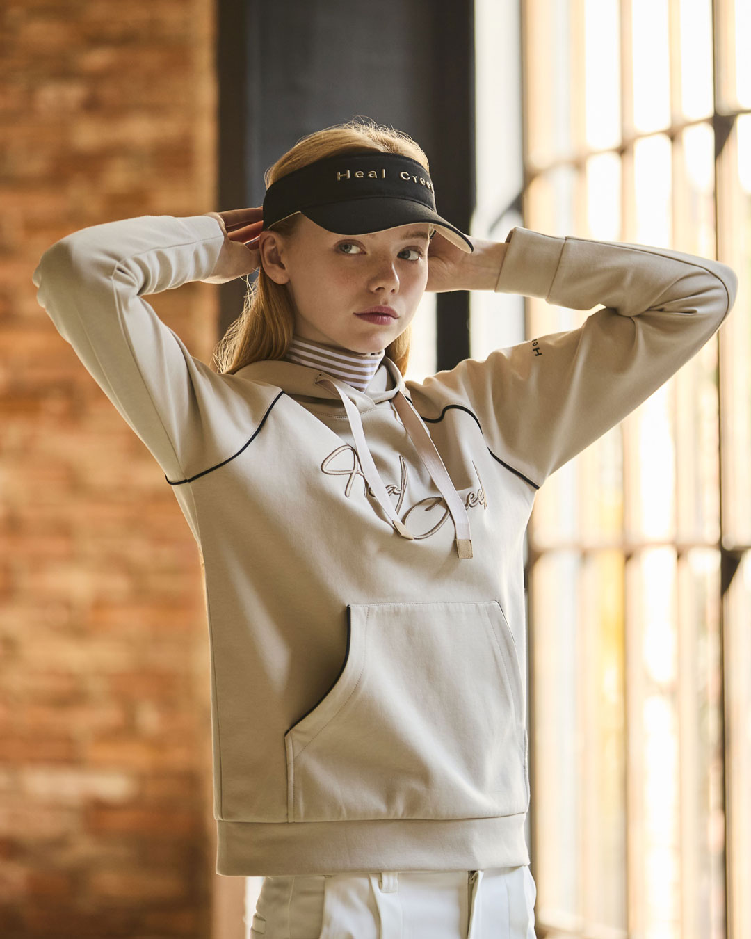 今シーズンから登場した筆記体ロゴが印象的なフーディに、美脚シルエットを叶えるパンツを合わせた洗練スタイル。シックな配色のパイピングが上品さを添え、カジュアルになりがちなパーカーコーデを大人顔に。ラウンドでもタウンでも品よく決まります。