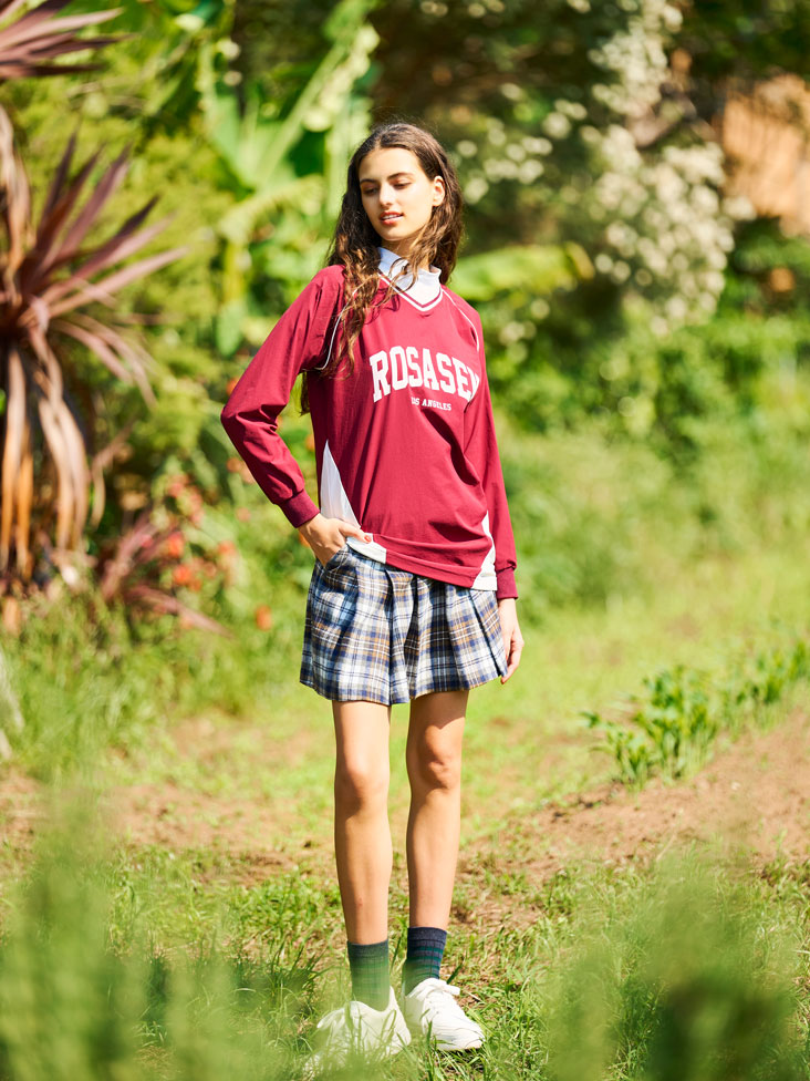 秋らしい季節感を取り入れたカジュアルでスポーティーなコーディネートが魅力です。トップスには、深みのあるバーガンディカラーのロゴ入りプルオーバーを採用。秋らしい暖かみのある色合いが、季節感を演出しつつ、胸元のロゴがスポーティーな印象をプラスしています。白いシャツをレイヤードすることで、清潔感ときちんと感を加えています。裾がドロストになっていて着丈を自由に変えられるところもポイント。ボトムスには、チェック柄のプリーツスカートを合わせ、クラシカルでトラッドな雰囲気を演出。動きやすさを考慮したデザインで、ゴルフ場での快適なプレーをサポートします。秋の爽やかな空気を感じながら、快適にプレーを楽しめる一着です。