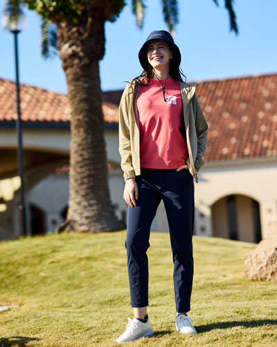 ANYDAYGOLFシリーズのブルゾン×パンツにハットを合わせた機能派コーデ。ネイビーを基調に、インナーのピンクが映える配色で、上品さの中に軽快さをプラス。超撥水トリコット素材と高いストレッチ性、接触冷感・UVカット機能で快適な着心地を実現し、天候を問わずゴルフを楽しめます。
