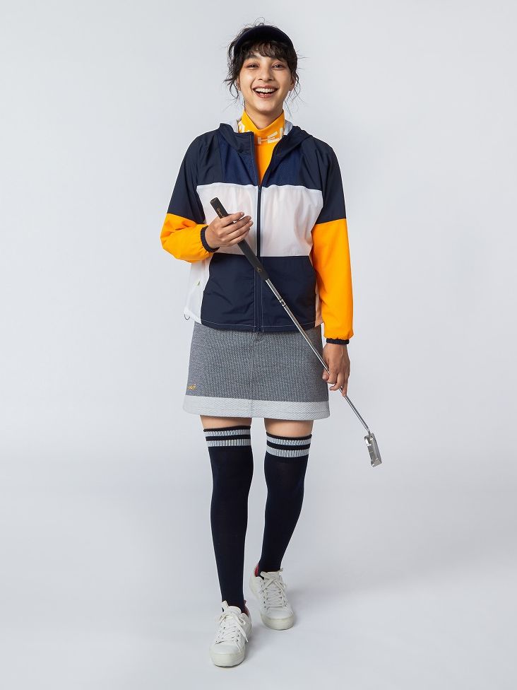 リラックスしたボクシーなシルエットのトップスに対して、ボトムスはコンパクトにまとめるのがポイント。タウンのファッショントレンドの流れから取り入れたバランスで、旬なスタイルにまとめています。トップスとボトムス共に小気味の良いカラーブロックで構成しています。