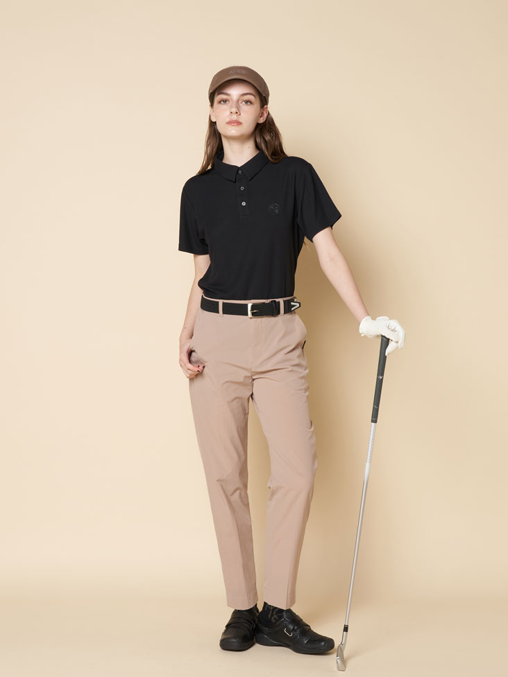 VIVA HEARTのキャラクター「ハートアイ」のラメプリントを胸元にあしらったモードキッチュなポロシャツと、軽やかなモカカラーのテーパードパンツを合わせた、暑さの残る初秋にぴったりの大人なスタイリング。