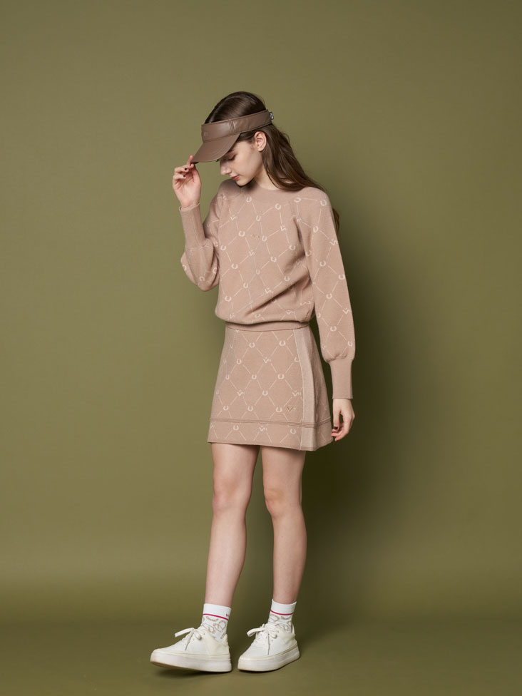 ニュアンスカラーのキュートなニットセットアップは、今期テーマの「Dressage(馬場馬術)」を象徴する馬蹄モノグラム柄。同系色のレザーバイザーを合わせてファッション感のある大人ガーリーなスタイリングに。抗ピリング素材で滑らかな触り心地のもちもちニットです。