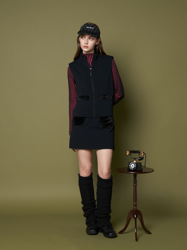 艶感のあるファーをあしらったベストとスカートのセットアップ。レッグウォーマーはその日の気分に合わせてニットとファーのリバーシブルで使える便利アイテム。全体をブラックでまとめ、ピンクのバイカラーニットが映えるスタイルに。