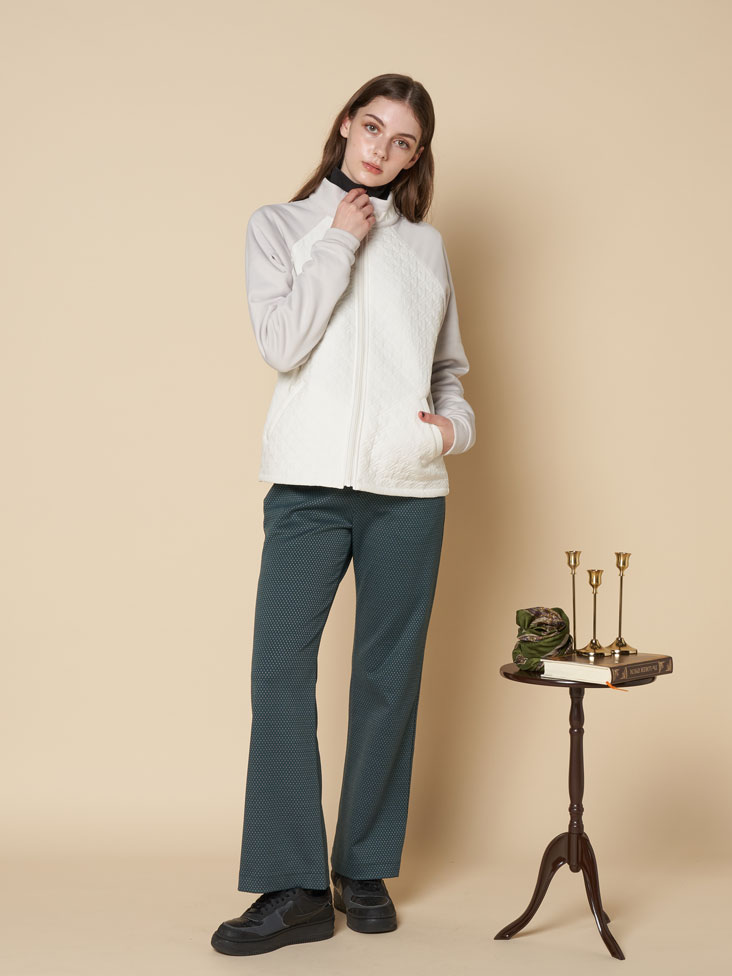 美しいウエストラインのスタンドブルゾンと細身フレアのジャカードパンツを合わせたスマートスタイル。ブルゾンは裏面が保温素材で防寒性抜群。袖は伸縮性の高い素材との切り替えで動きやすいラグラン仕様。パンツの後ろポケットには馬蹄×ハートのモチーフ「シュバルハート」の刺繍入り。