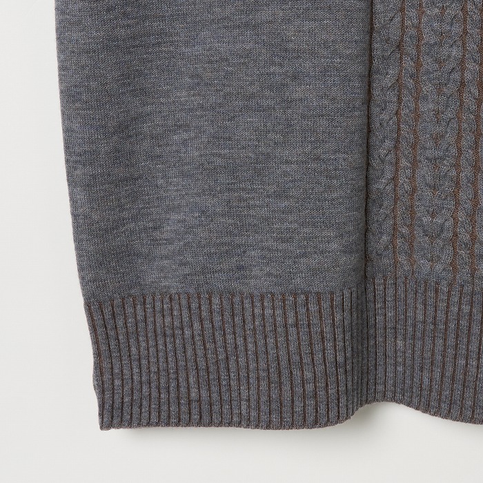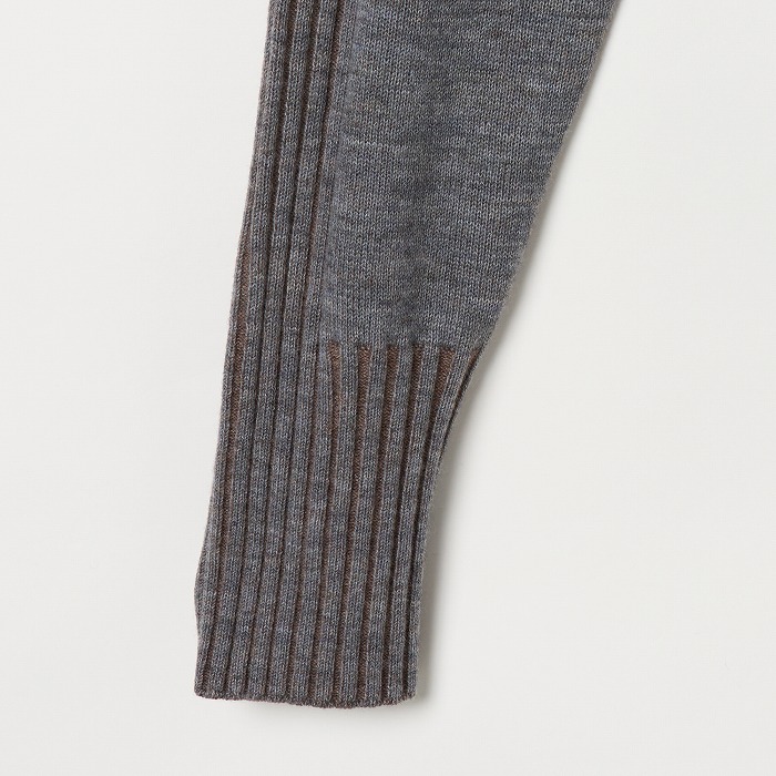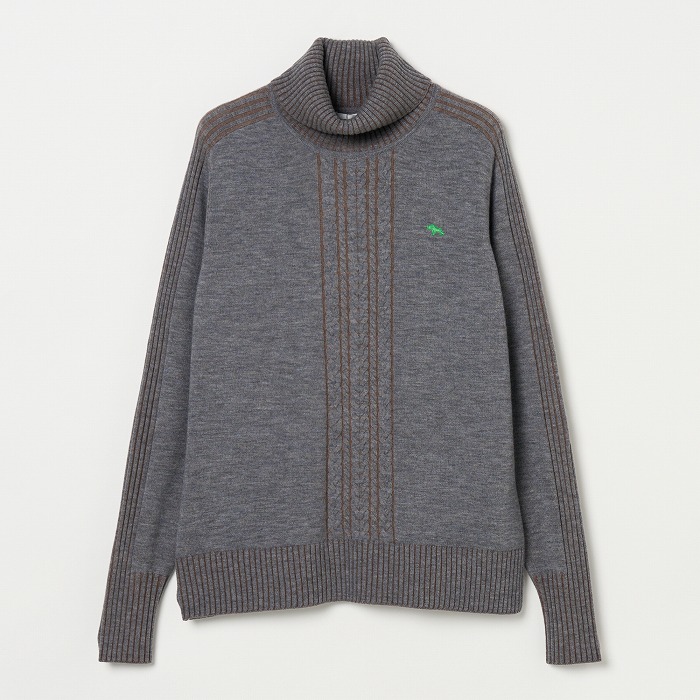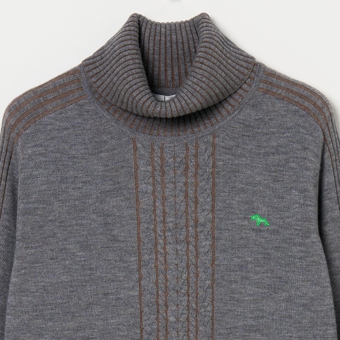 今シーズン一押しのベーシックニット。表と裏に異なる色を使用したプレーティングという手法を用いたニットです。2色の糸が織りなす複雑で曖昧な色味を活かして、シンプルな縄編みを取り入れました。ややゆとりのあるサイズ感で、カジュアルにもコンサバにも使いやすいデザインになっています。ゆとりのあるタートルネックになっており、伸ばしてクシュっと着ても可愛らしく決まります。