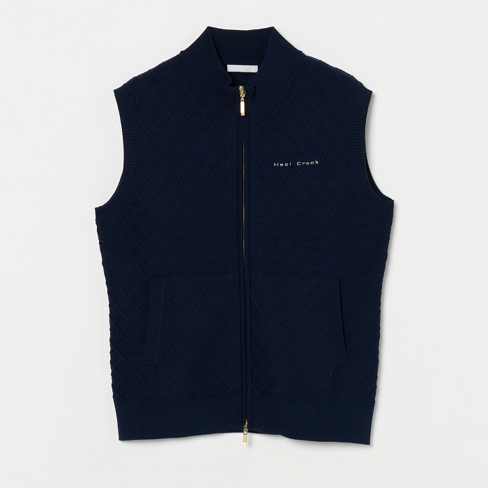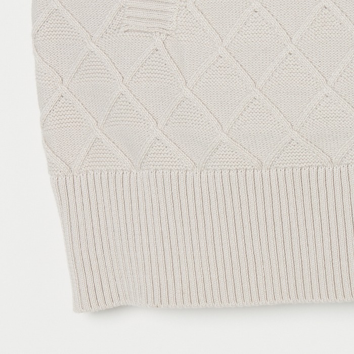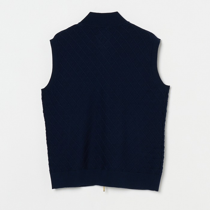 季節の変わり目に活躍するニットベスト。網目のような地柄模様が無地ながらも存在感を放つアイテムです。きらきらとしたボールチェーンが覗くような逆開のメタルファスナーを使用しています。同素材のスカートと合わせれば、上品なセットアップになります。
