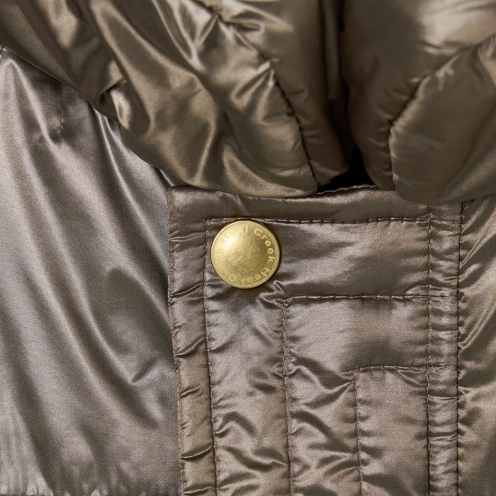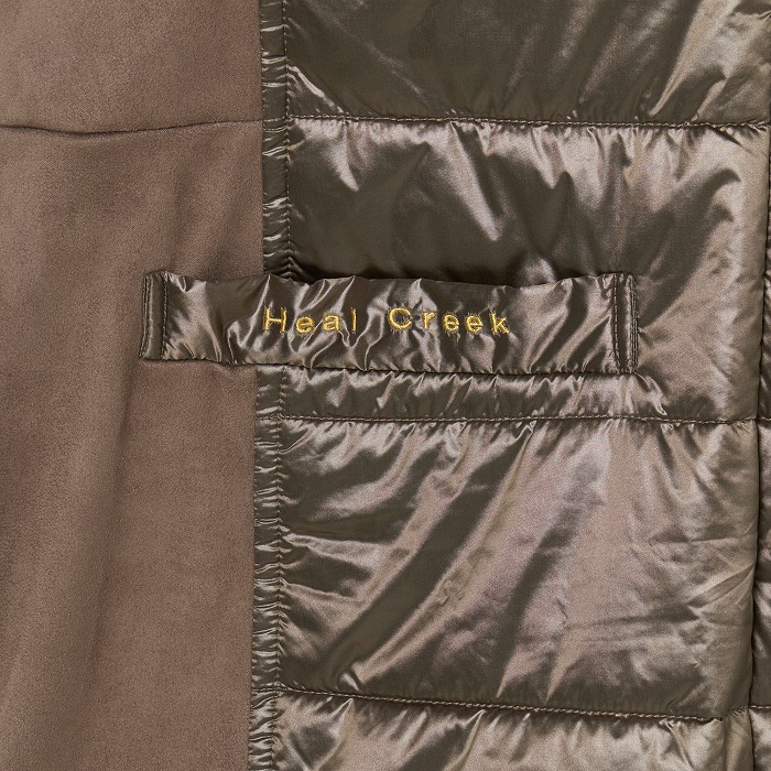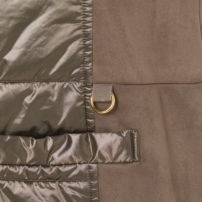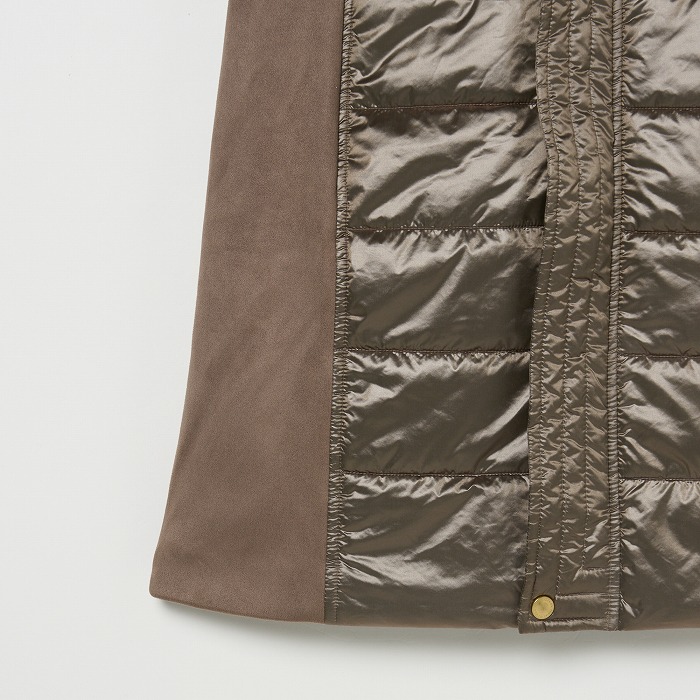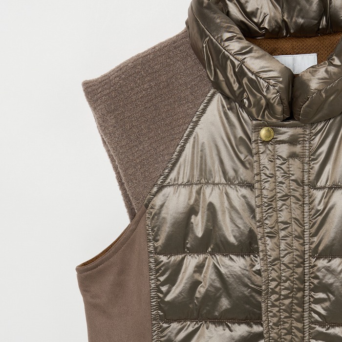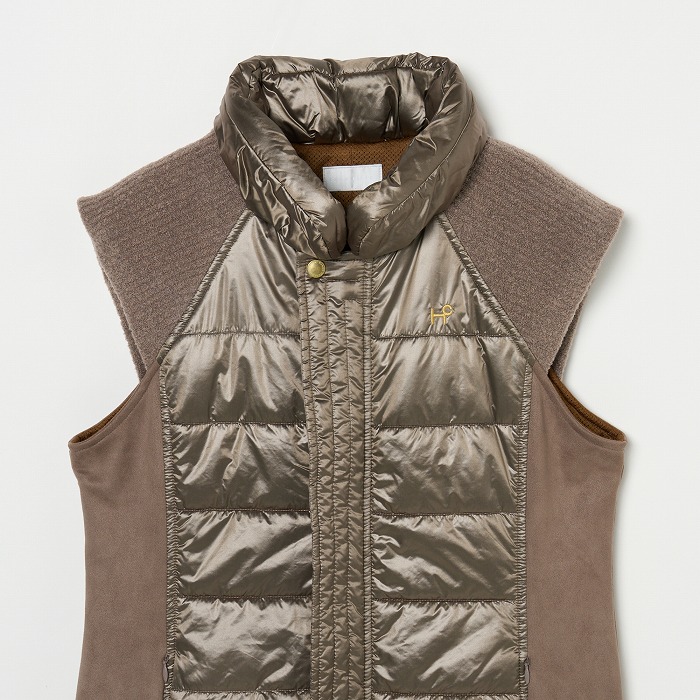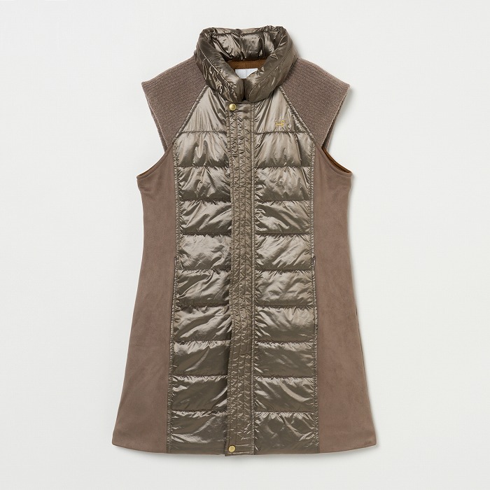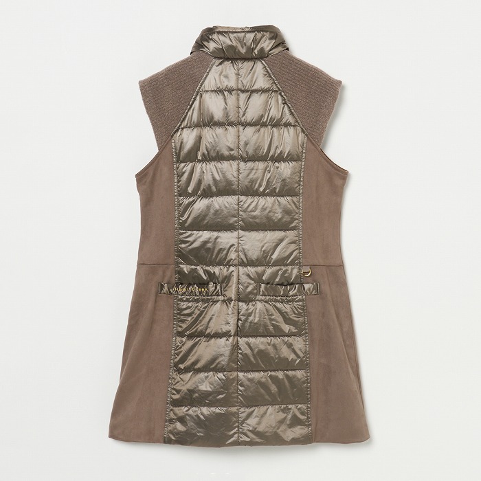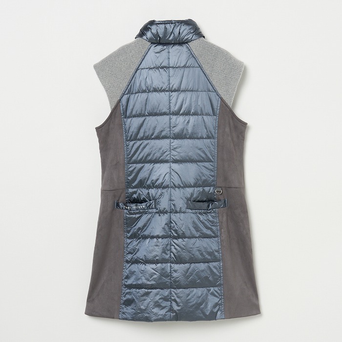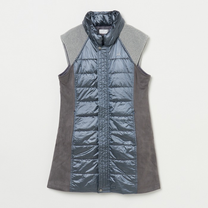 シャンブレータフタ×スエードフリースにブークレーニットでアクセントを加えた中綿ワンピース。シックな色を重ねて大人のゴルフウェアを作りました。大きく膨らませた衿は暖かいだけでなく小顔効果を発揮します。肩先を包むようなニット切替がモード感を演出して、従来の中綿ワンピースにはない新鮮なデザインです。オクタという特殊裏地を使用しており暖かくプレイできます。