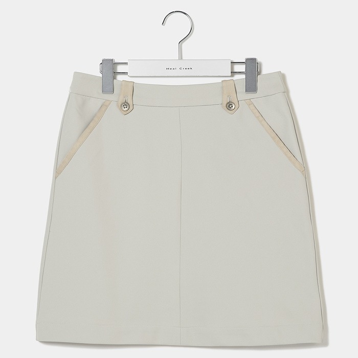 しなやかな伸縮性とお手入れの簡単さが魅力の中肉厚ピケ素材を使用したスカート。リサイクルヤーンで作られており、環境にも配慮した素材です。ピケの畝を縦横斜めに切り替えて、シンプルな台形スカートにアクセントを加えています。また、フェイクスエードのトリミングが施され、トラッド感もプラスされています。少し長めのスカート丈がカジュアルながらも落ち着いた印象を与えています。