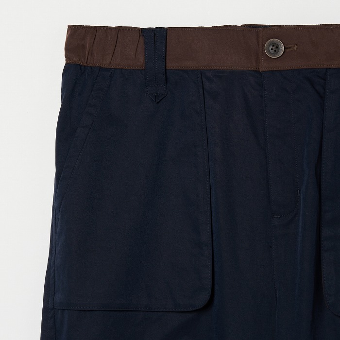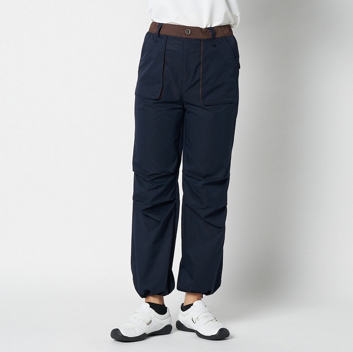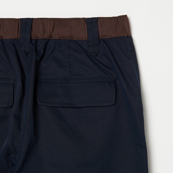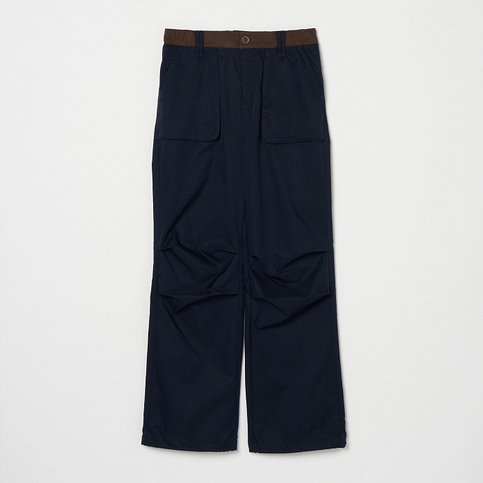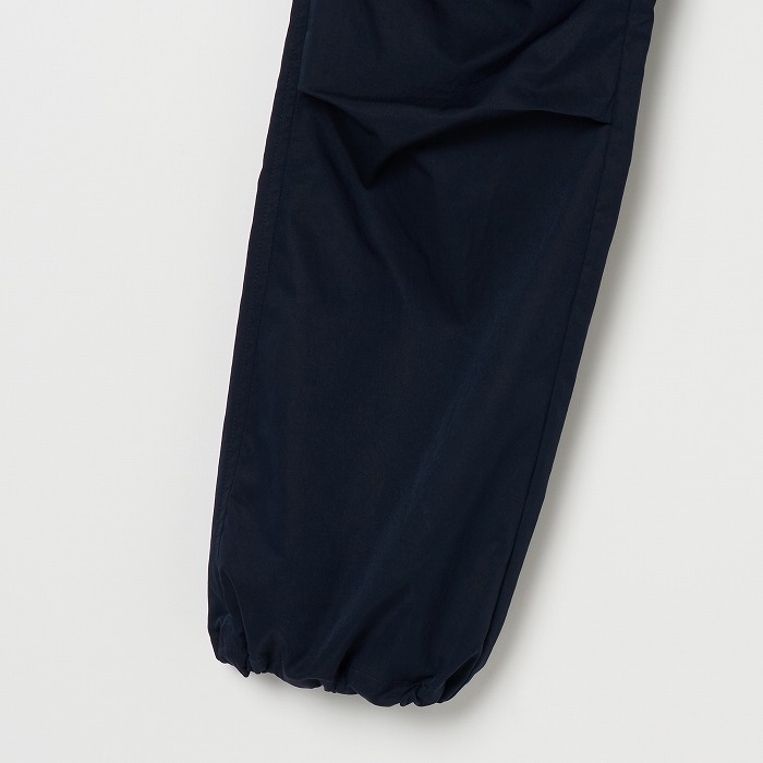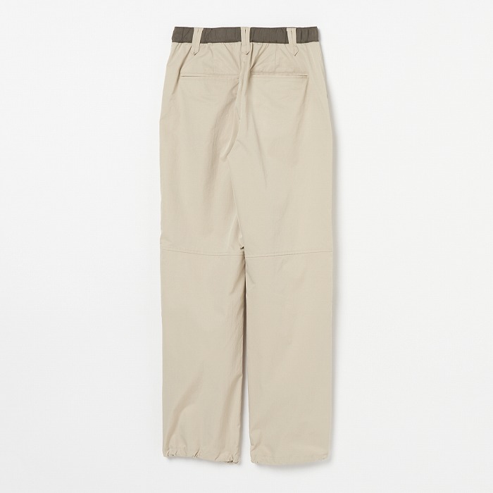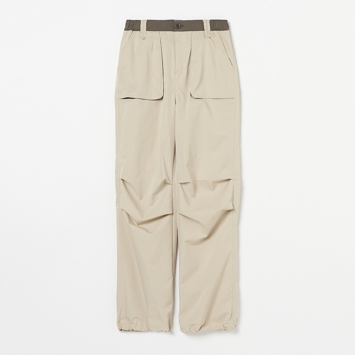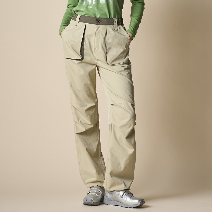 リラックスしたムードが漂うきれい目なパラシュートパンツ。マチやベルトに配色を効かせ、ひざを曲げやすいようにタックをとっています。一見普通のチノクロスのようですが、実はアレル物質を抑制する特殊加工を施した、ナチュラルな表情感のあるストレッチツイル素材です。ダブルになったベルトループなどディテールにも凝ったデザインです。