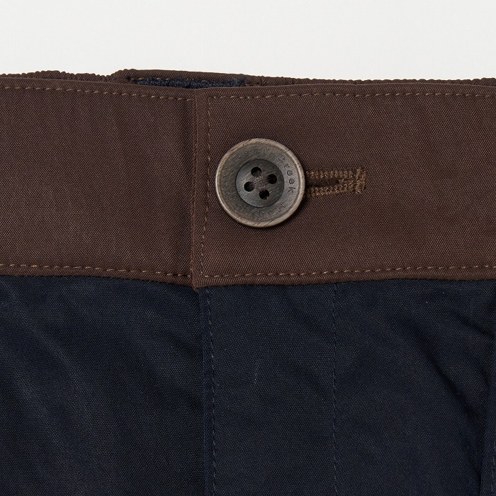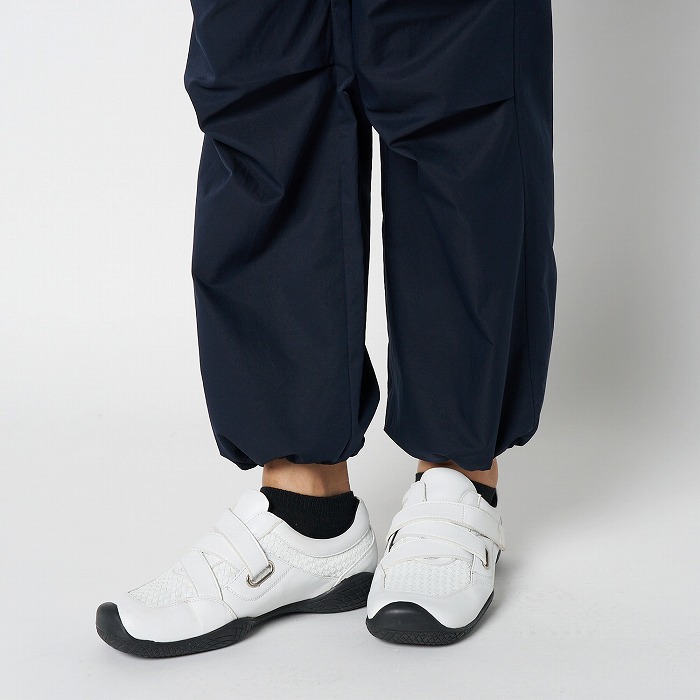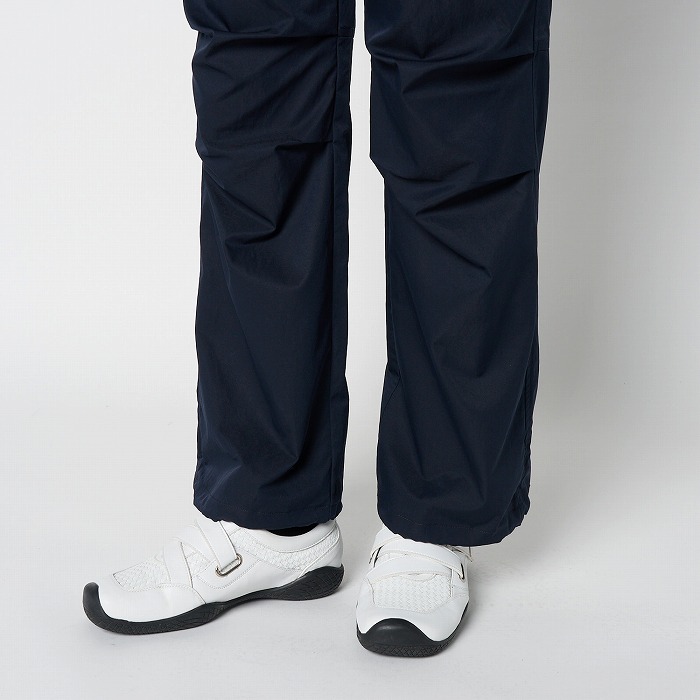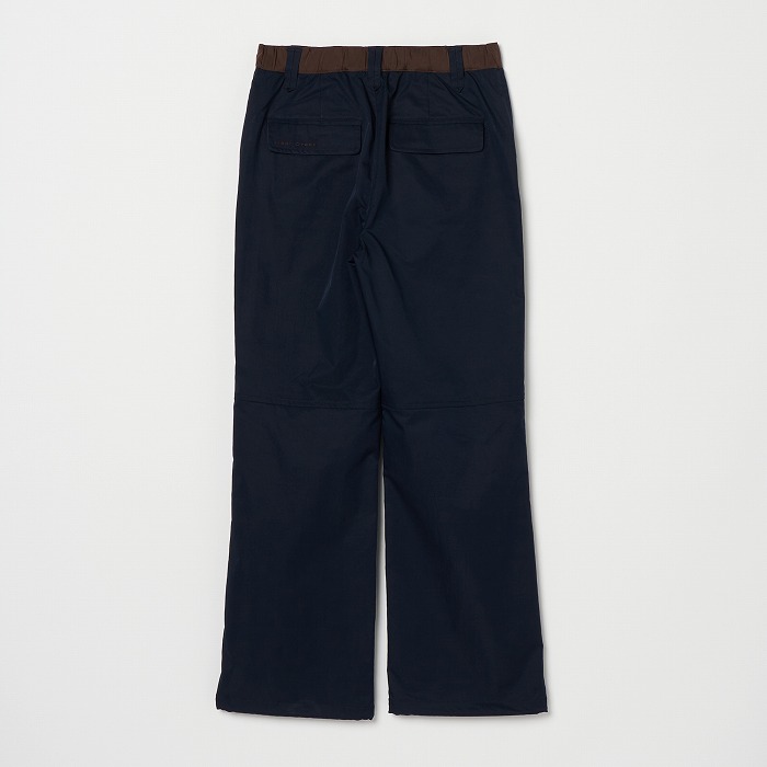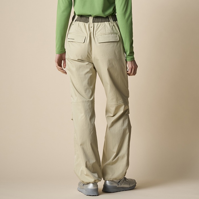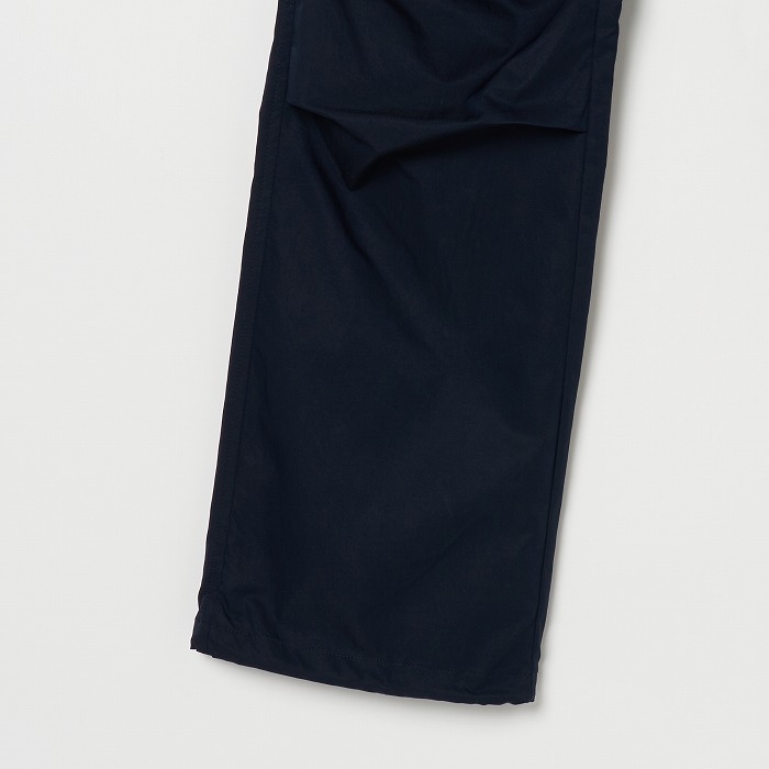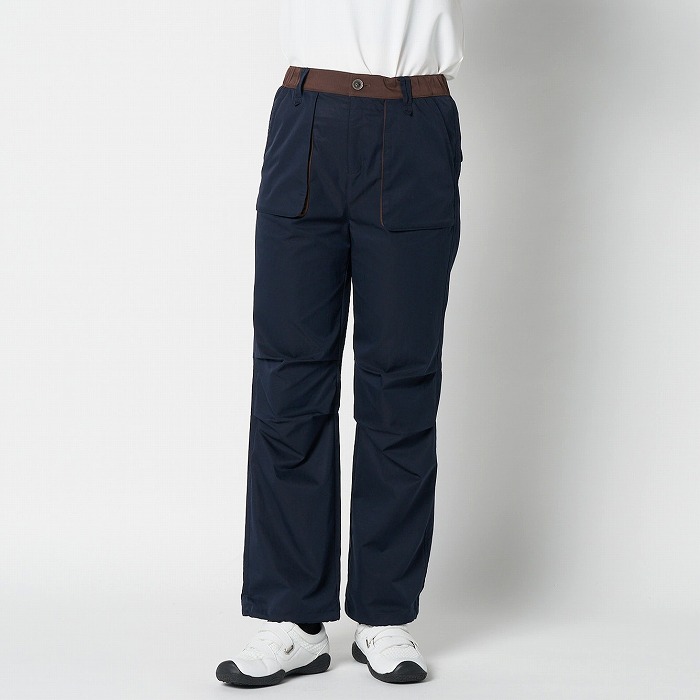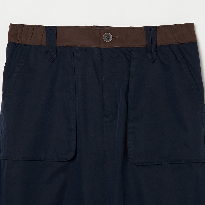 リラックスしたムードが漂うきれい目なパラシュートパンツ。マチやベルトに配色を効かせ、ひざを曲げやすいようにタックをとっています。一見普通のチノクロスのようですが、実はアレル物質を抑制する特殊加工を施した、ナチュラルな表情感のあるストレッチツイル素材です。ダブルになったベルトループなどディテールにも凝ったデザインです。