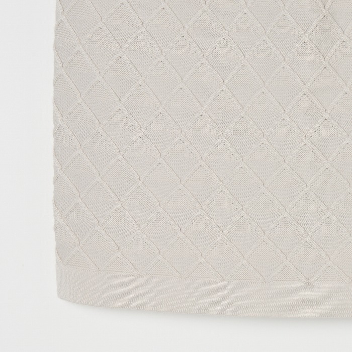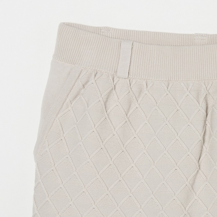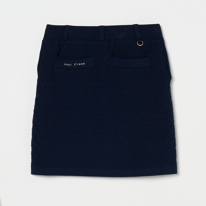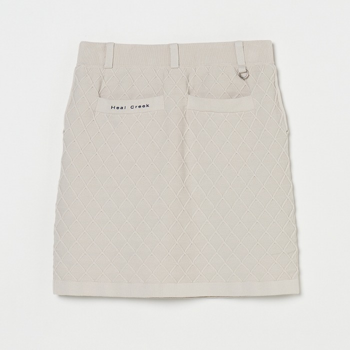 網目のような地柄模様が無地ながらも存在感を放つニットスカート。ウエストは総ゴム入りで前後に2つずつのポケットが付いています。ベルトループには丸カンもセットされており、必要な小物を下げることが出来ます。同素材のベストとセットアップで着こなせば、きちんと感のある上品なルックスになります。(トリコット裏地付き)