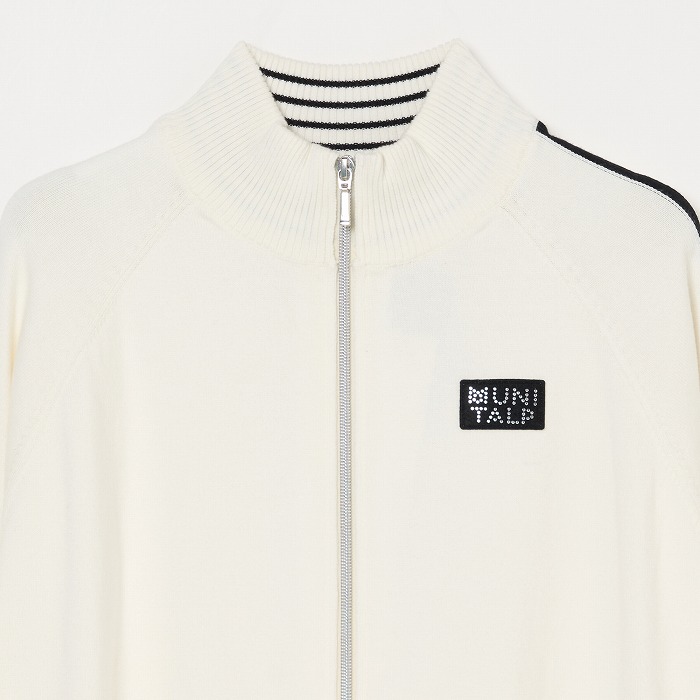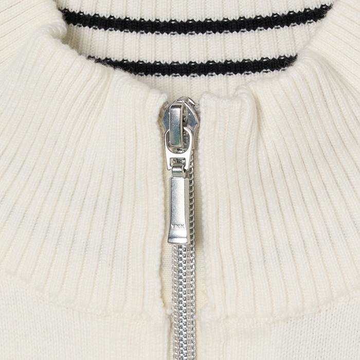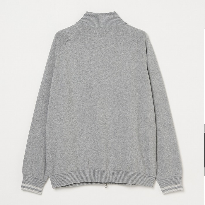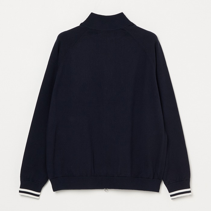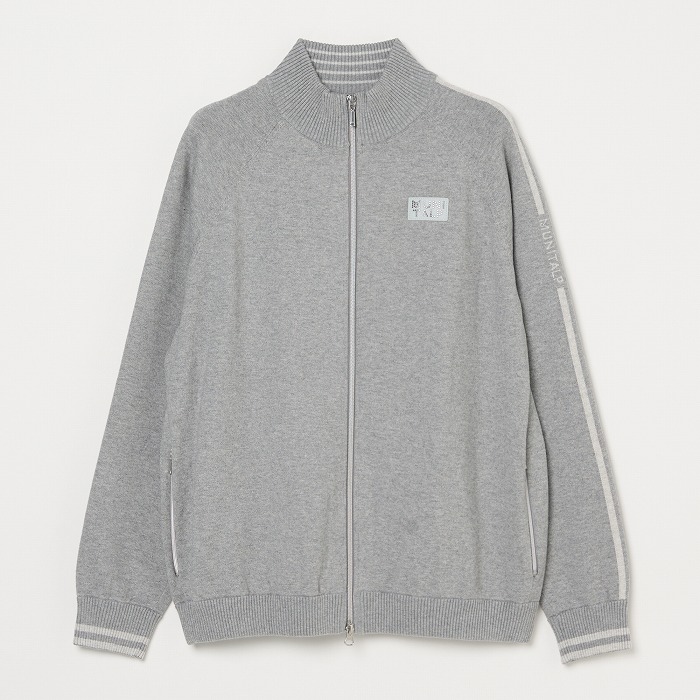 表が2/32の綿カシミア、裏がポリエステルの糸を使いダンボールのような組織でニットのフルジップブルゾンを作りました、裏は起毛素材とのすべりもいいようにつるっとしたポリエステル糸を使っています。左袖に配色ラインとロゴを入れました。