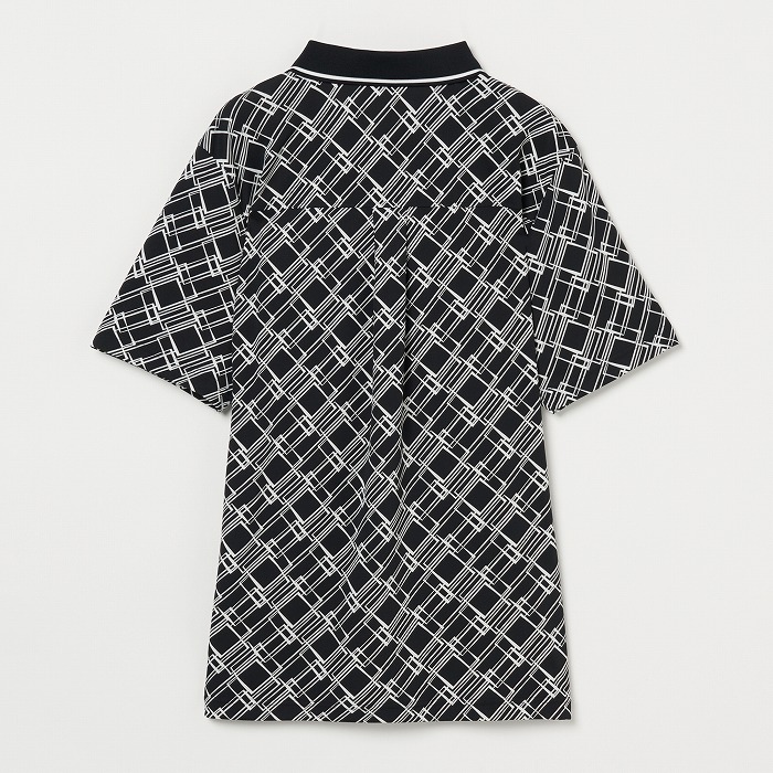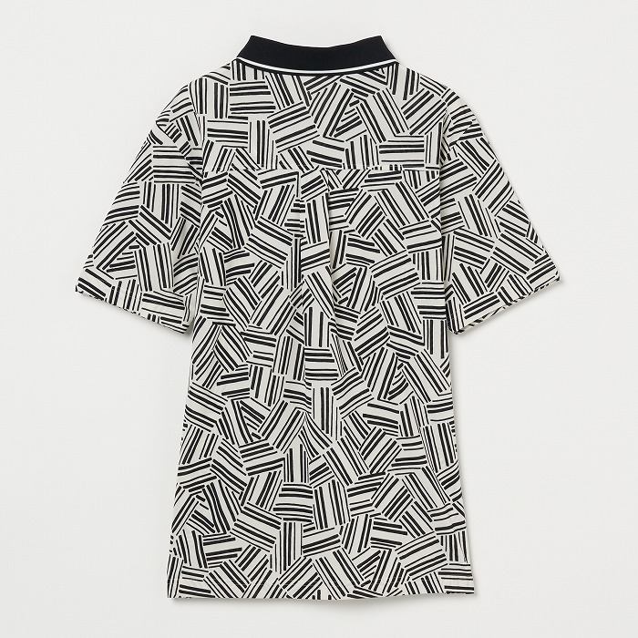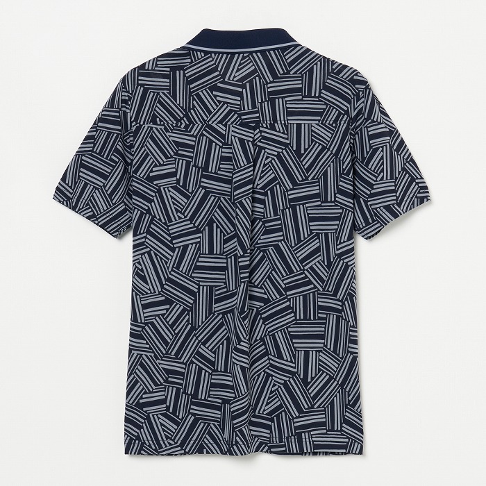 シワになりにくい強撚スムースの半袖ポロ ペンで描いた額が重なっているような コルニーチェ(額縁)柄 ラインテープを切って重ねた様な柄です。衿は濃色で締めています。
