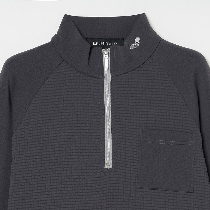 軽さと適度な保温性、通気性のあるオールシーズン着用できるミドラー。あったか機能アンダーを着て その上にポロ、その上にこれを着用して ウインドブレーカーを羽織れば2月のゴルフは大丈夫。暖かくなるにつれて、一枚ずつ脱いでいってください。朝晩の寒暖差が大きい時期などは 上に着用して お昼になったら脱いでください。身頃には グリッド柄を表使いにしてコントラストをつけ、左袖にはメタリックなロゴプリントを施しています。