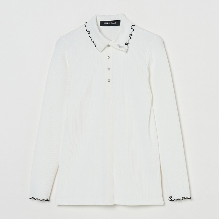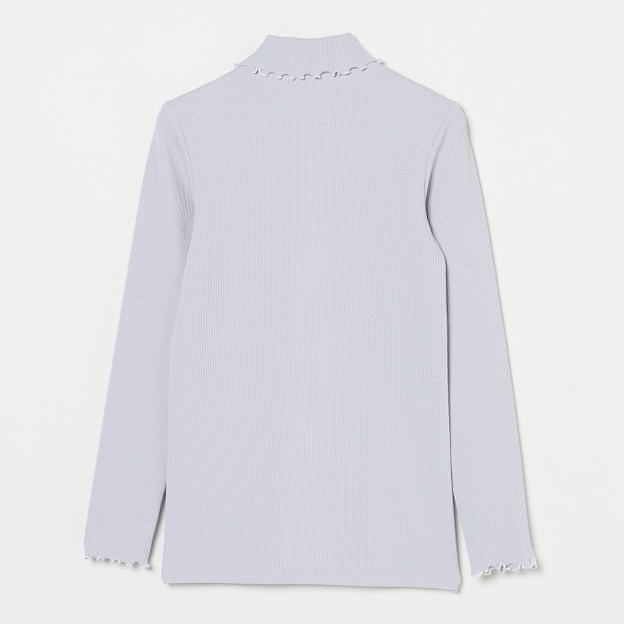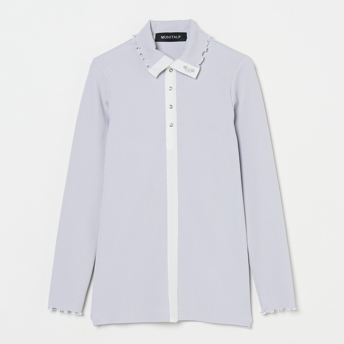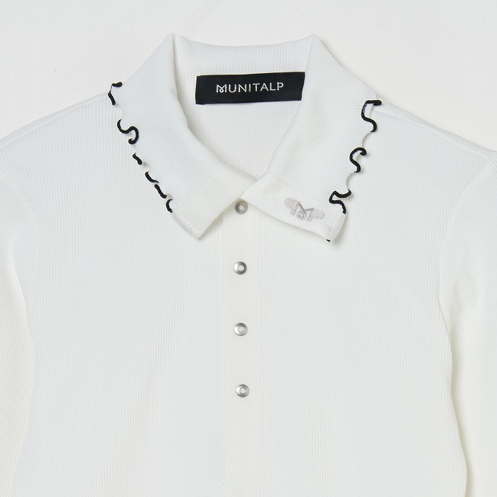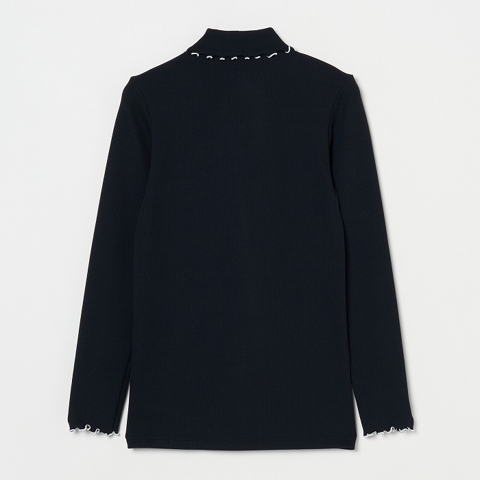 チューブ状になったポリエステルのリブジャージで長袖のポロを作りました。リブなのでのびのびで、サイズを選びません。どなたでもきれいに着ていただけます、そして脇シームがないことで、着心地がいいです。衿端には配色でメローミシンをかけてフリルにしています。前立てはグログランテープで締め、細く見えるようにしています。どなたでも着用できますが、身幅が大きすぎると、着丈が短くなるので、一度ご試着いただき、バランスを確認してお買い上げいただきたいです。