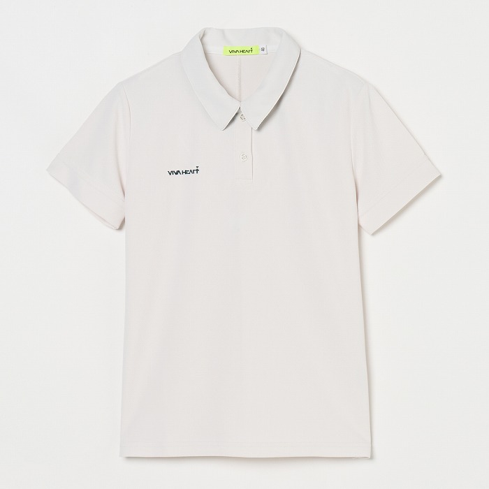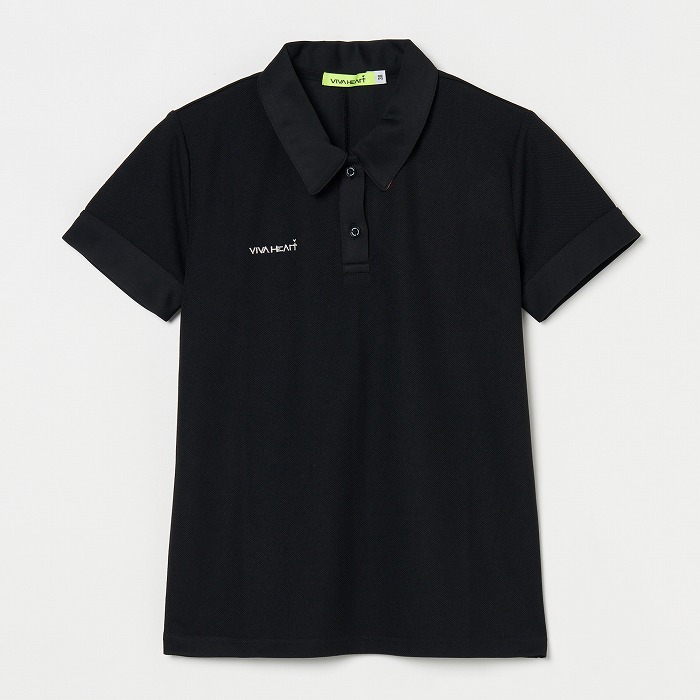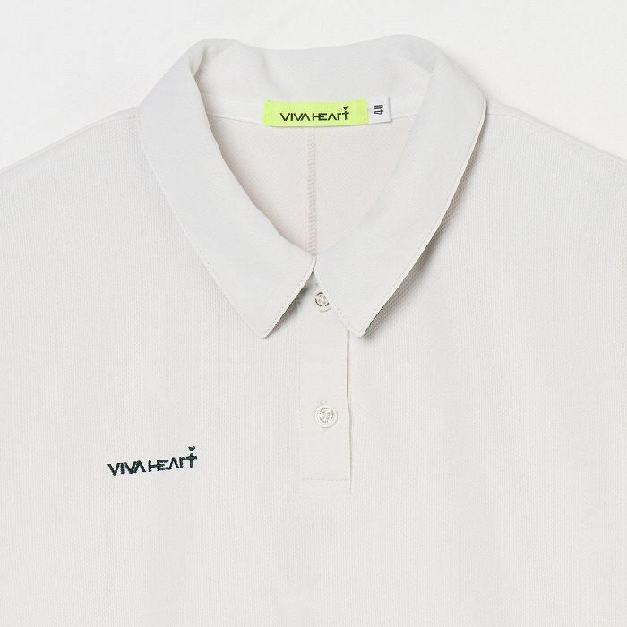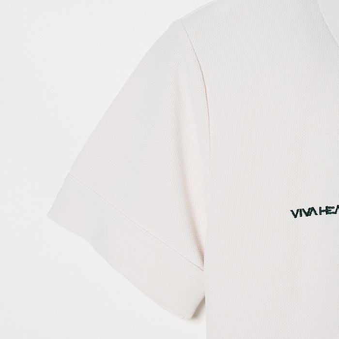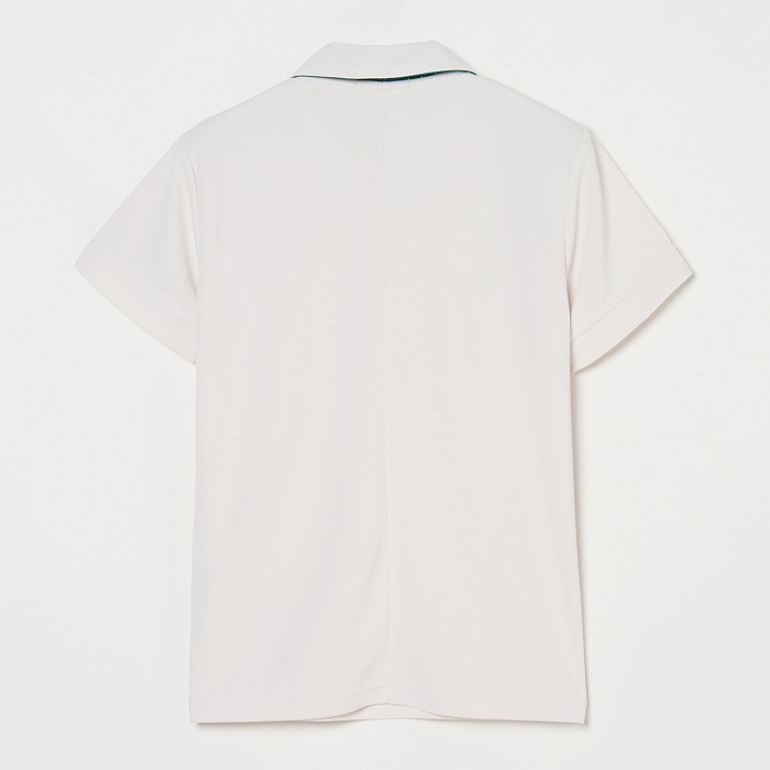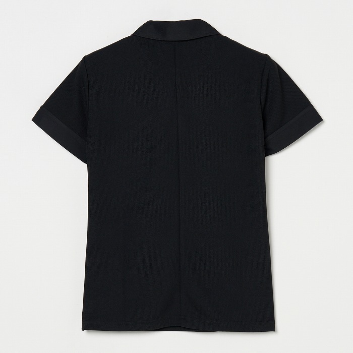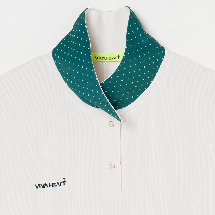 上品でガーリーな印象のハートドット総柄を衿裏に配した半袖ポロ。衿を下せば無地見えする着回し抜群のアイテムです。衿裏柄と同配色のダイヤゴナルのボトムスとの合わせもおすすめです。袖口の切替は二の腕をカバーし、ウエストシェイプデザインなのでさり気ないスタイルアップを叶えます。バックスムースの細かな鹿の子素材で、暑さの残る秋のゴルフにぴったりな吸水速乾素材。
