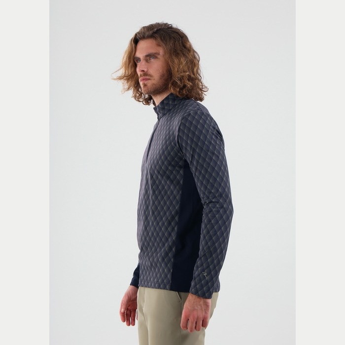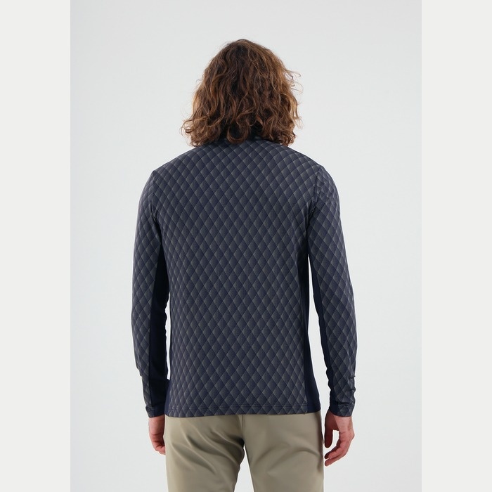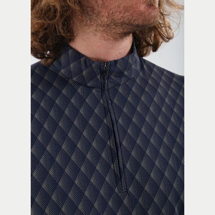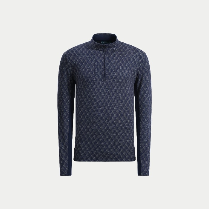 このハーフジップトップは、ブラッシュドジャージー生地を使用し、オプティカルとロゴのプリントが施されています。高い伸縮性と優れた手触りで、寒い天候でも暖かく快適に過ごせます。内側は柔らかくブラッシングされており、シンプルでありながらアイコニックなデザインが魅力です。日常使いやアウトドアに最適な一着です。