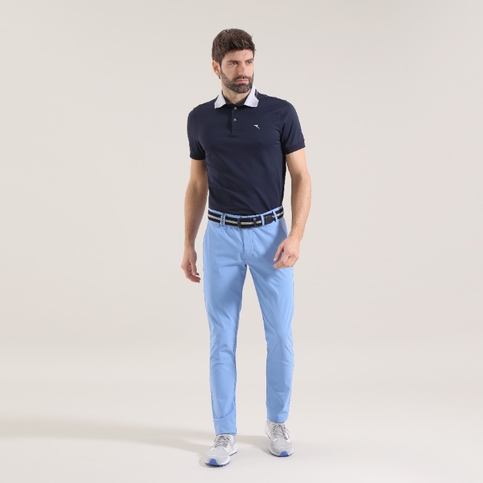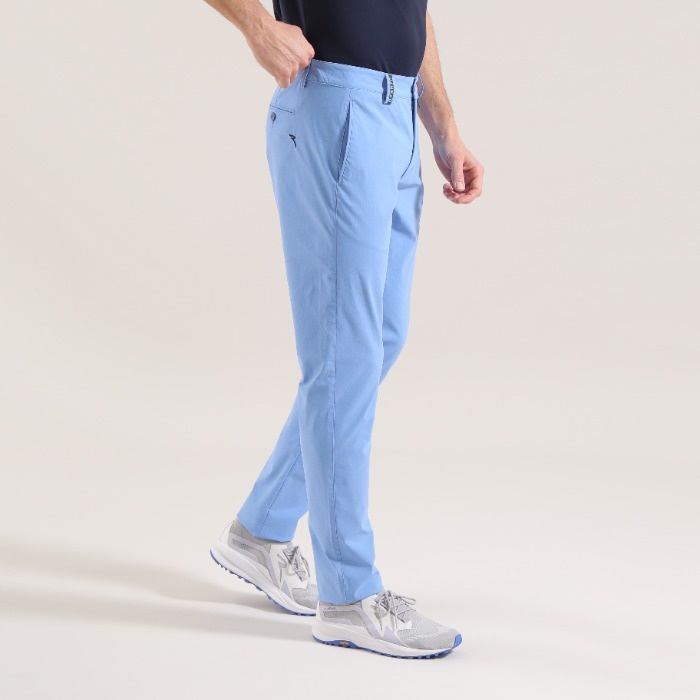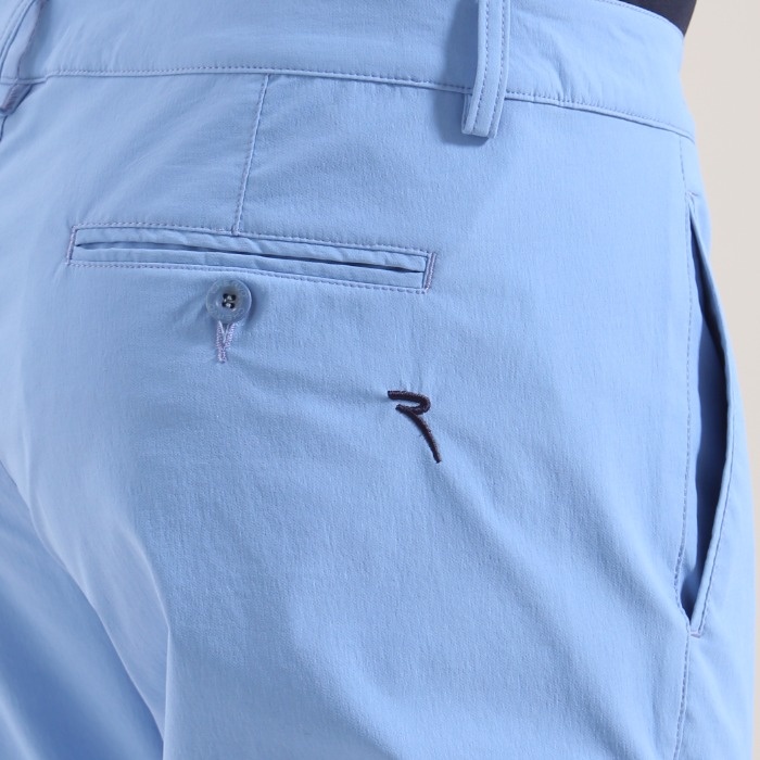 UVカット機能のついた無地のパンツ。裾幅は17㎝。後ろのポケット口は両玉縁タイプ。右後ろポケットサイドにRマークの刺繍があります。