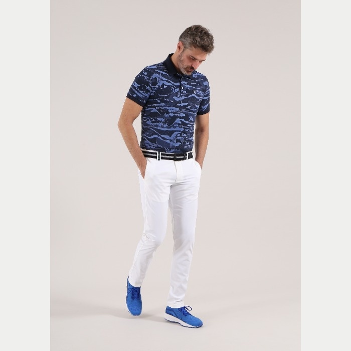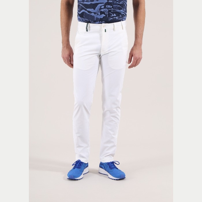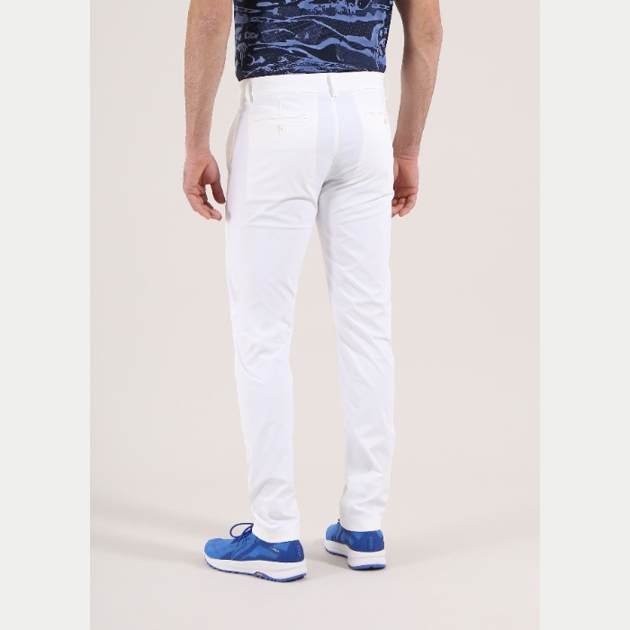 UVカット機能のついた無地のパンツ。裾幅は17㎝。後ろのポケット口は両玉縁タイプ。右後ろポケットサイドにRマークの刺繍があります。
