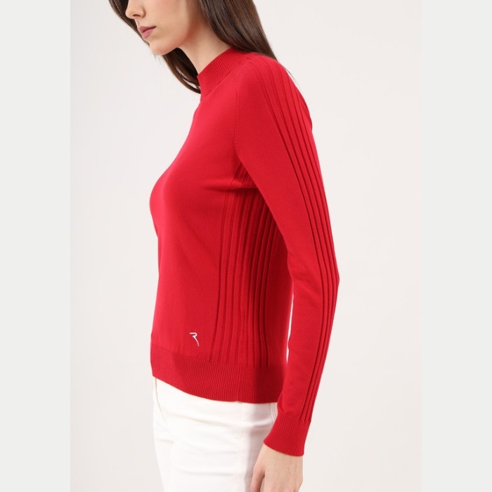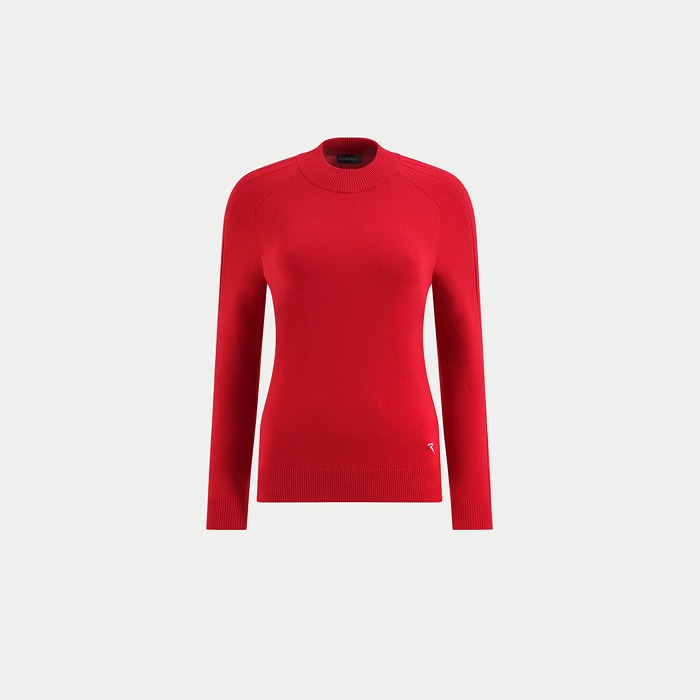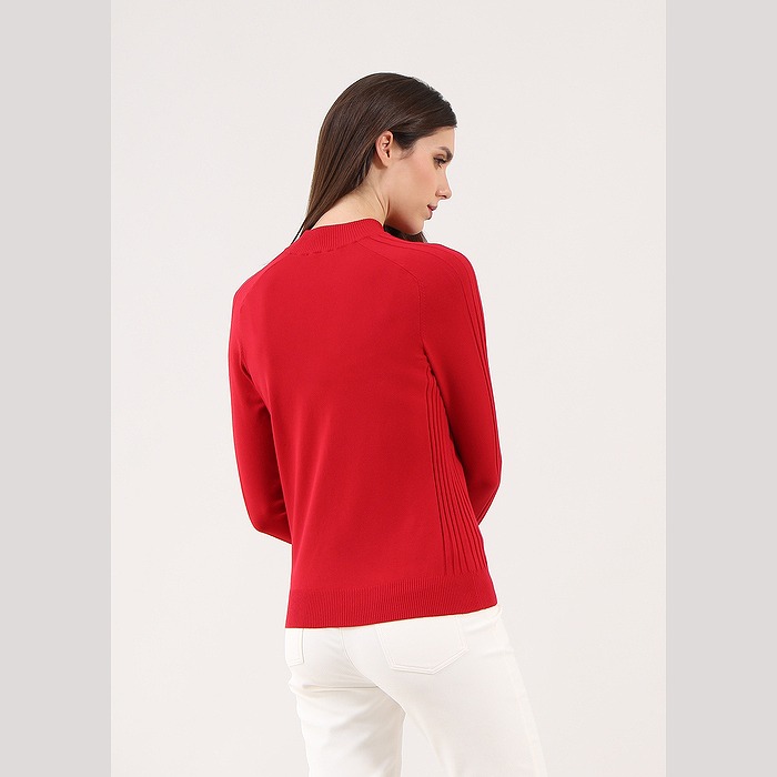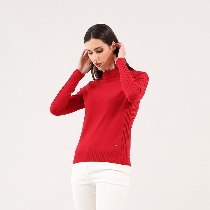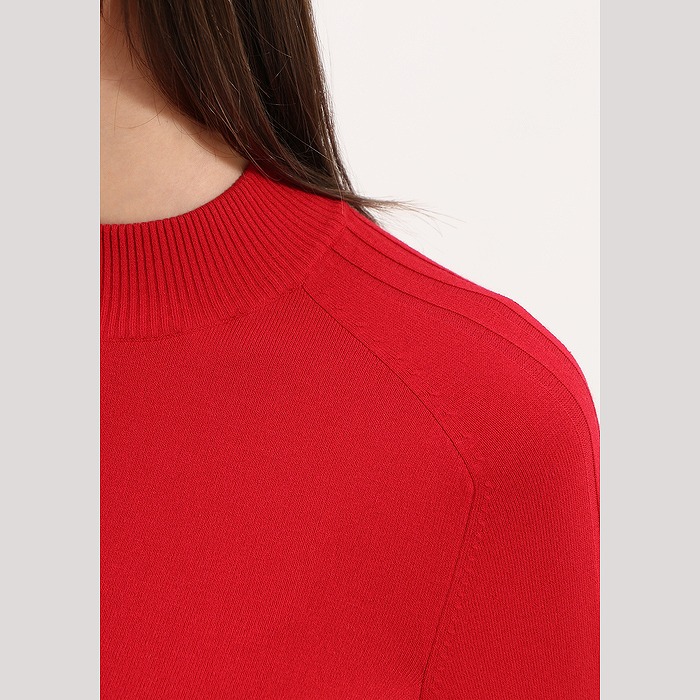 モックネックタイプのニット。素材はビスコース/ポリエステル。非常にクリーミーな手触りとなります。シーズン初めの早い時期からの着用が可能です。