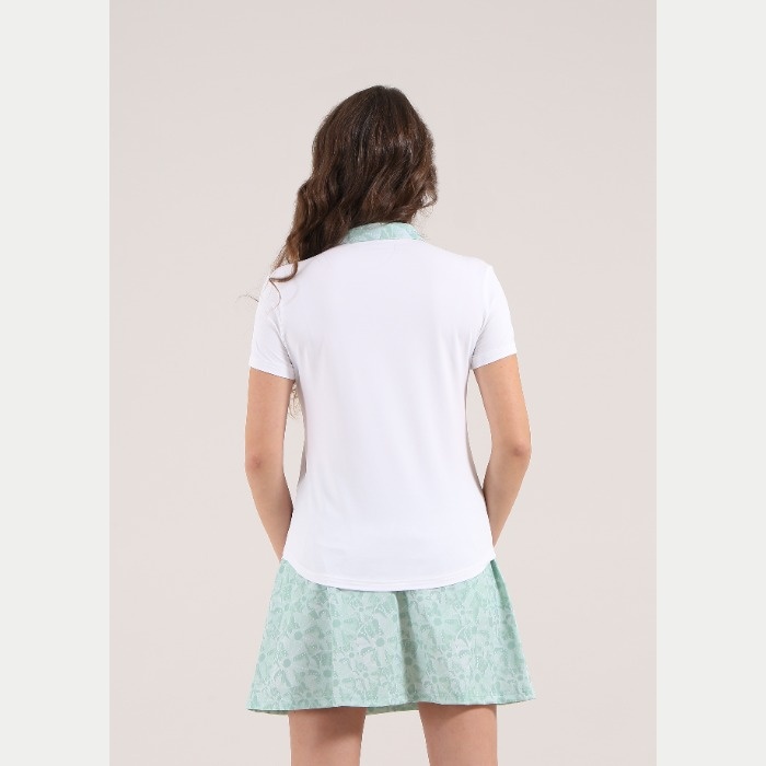 前立てと襟部分にプリントの生地をはめ込んだ半袖ポロシャツ。素材機能としては、吸水速乾、UVカットとなります。