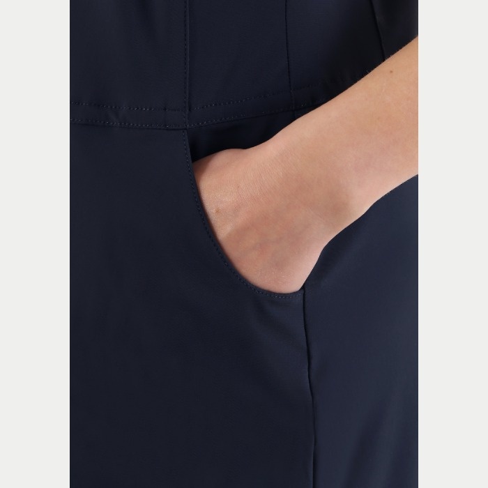 無地のノースリーブワンピース。前立てはジップアップとなります。着丈88cm。ウエスト部分にティーホルダーあり。素材はナイロン/ポリウレタンで、素材特性はUVカット、吸水速乾、4WAYストレッチとなります。