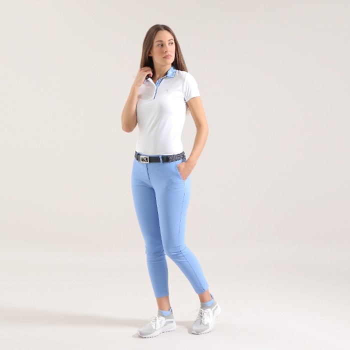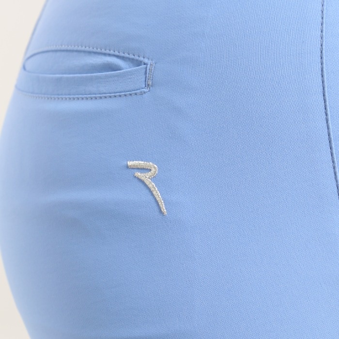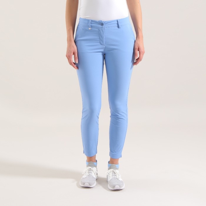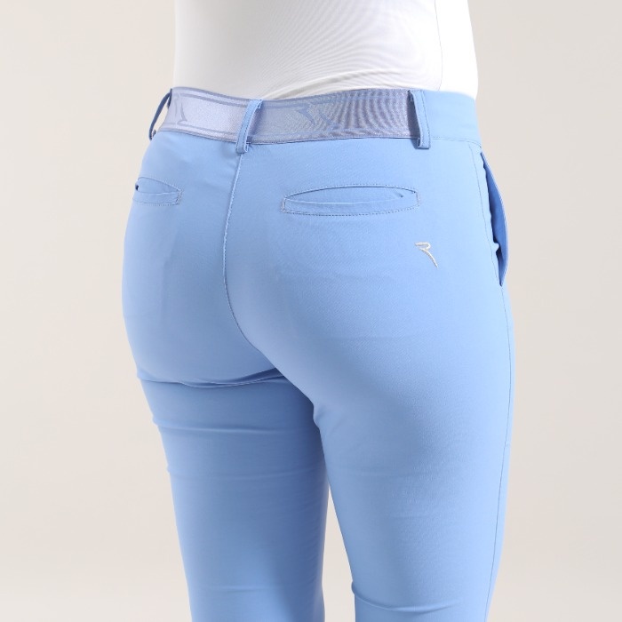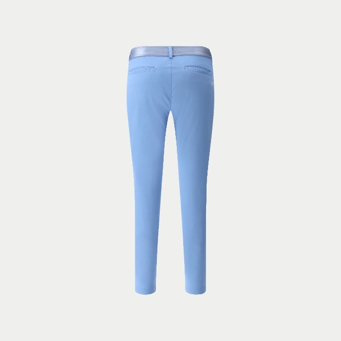 裾幅13㎝のやや細身のロングパンツ。ウエスト後ろ部分はストレッチ素材を嵌め込んだデザインとなります。素材機能はUVカットとなります。