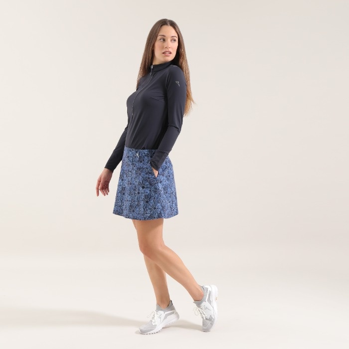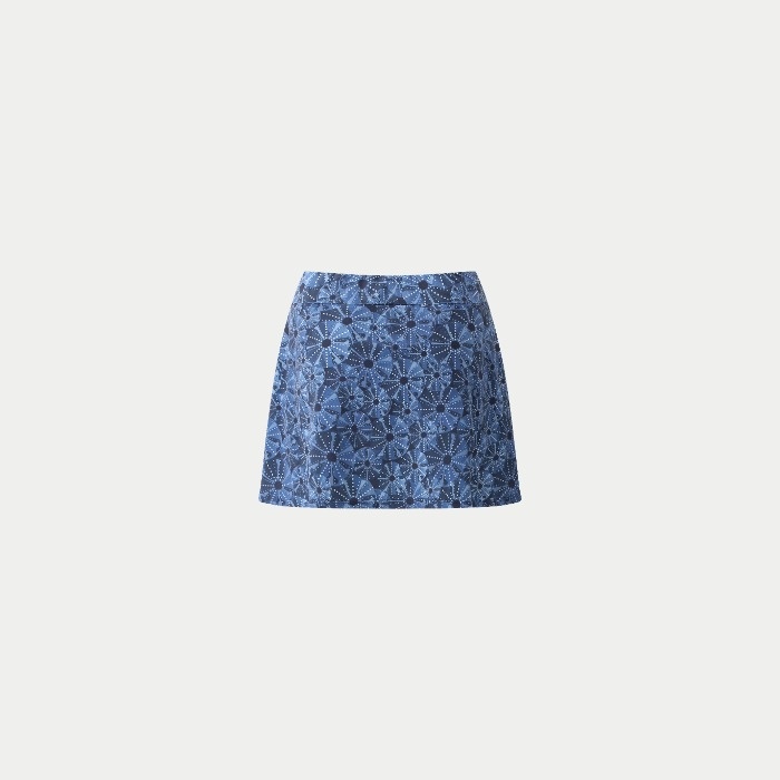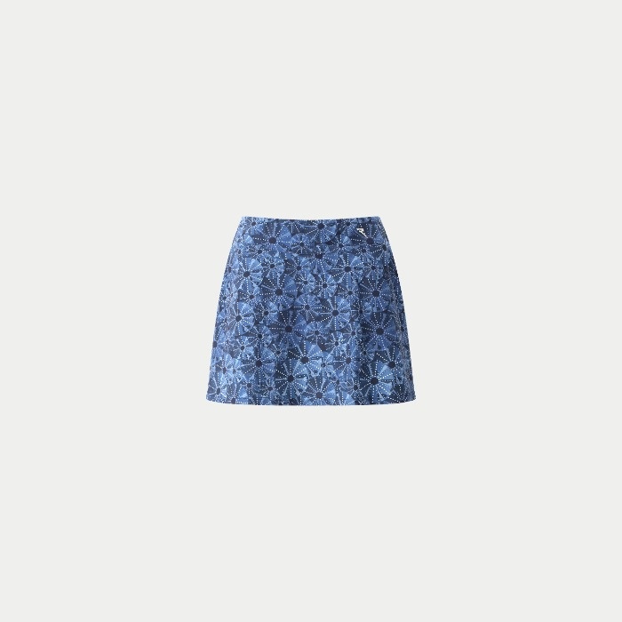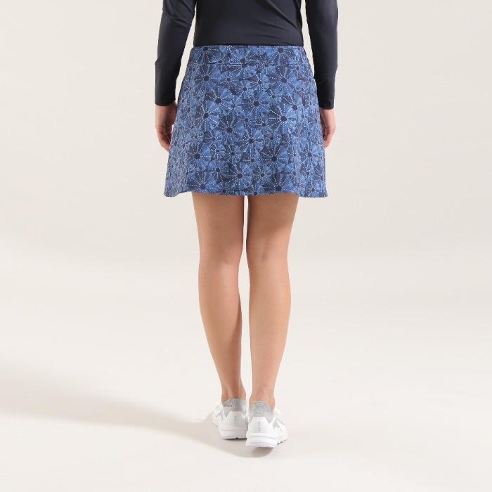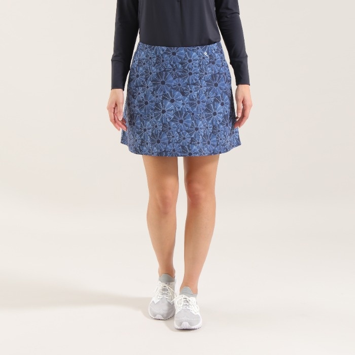 今シーズンの柄をモチーフにした総柄のスカート。総丈42㎝。素材機能としては、UVカット、4WAYストレッチとなります。