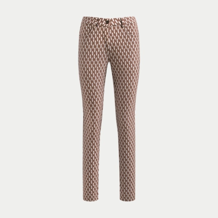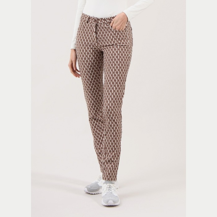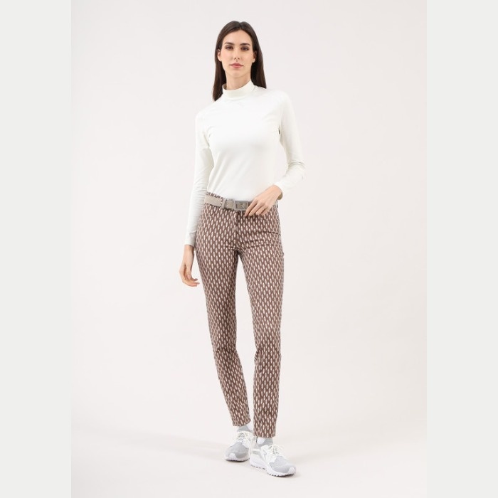 スーパーストレッチ素材を使用した5ポケットパンツ。マットな質感と全体に施されたプリントパターンが特徴で、スタイリッシュな印象を与えます。ゴルフシーンでも快適に動けるデザインで、プレー中の動きやすさを追求しました。おしゃれで機能的なゴルフウェアをお探しの方にぴったりのアイテムです。