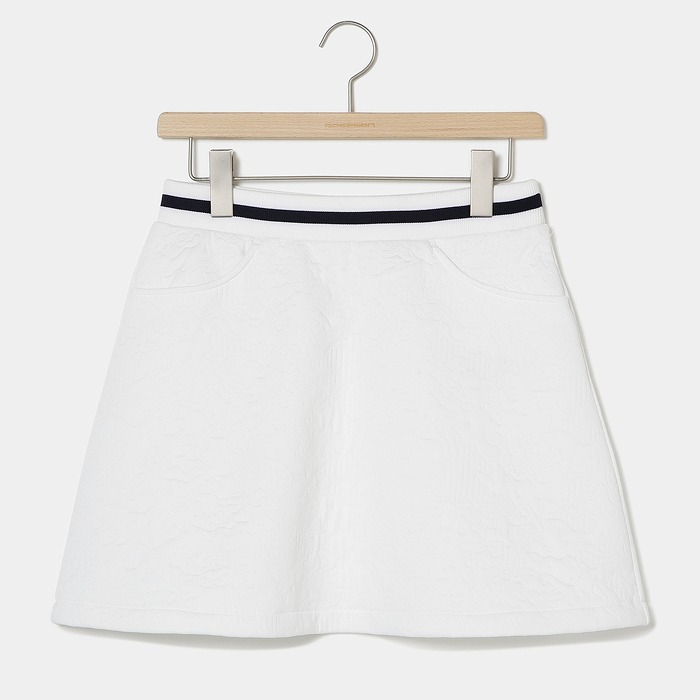 都会の輝きや光線をイメージした線画カモフラ柄をジャカードで表現した、軽量感と薄さを訴求したポリエステルのを使用。ウエストゴムのイージースカートで着脱もし易く、ウエストの配色ラインをアクセントにしたフレアシルエットのアイテム。単品だけでなく、お揃いのプルオーバーと上下セットのコーディネートもお勧め。
