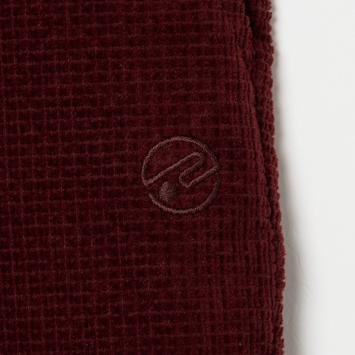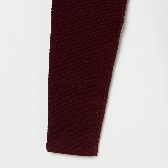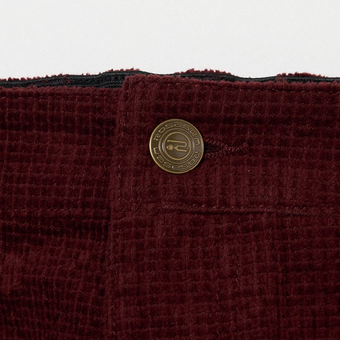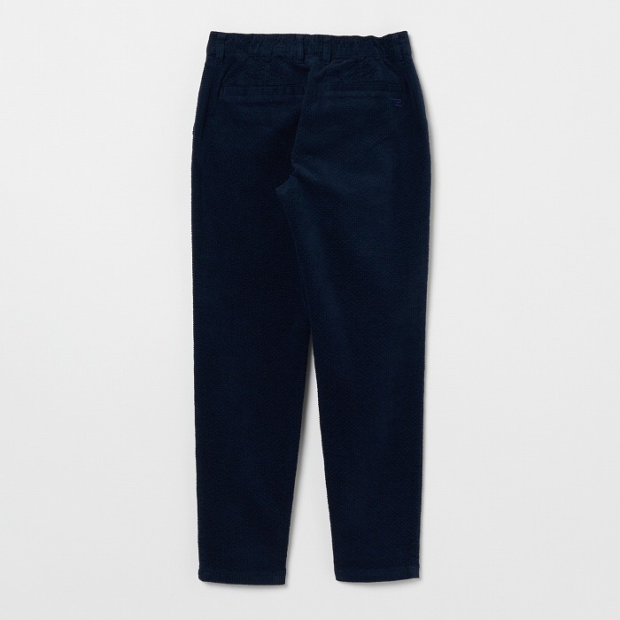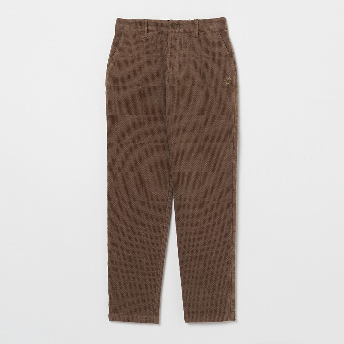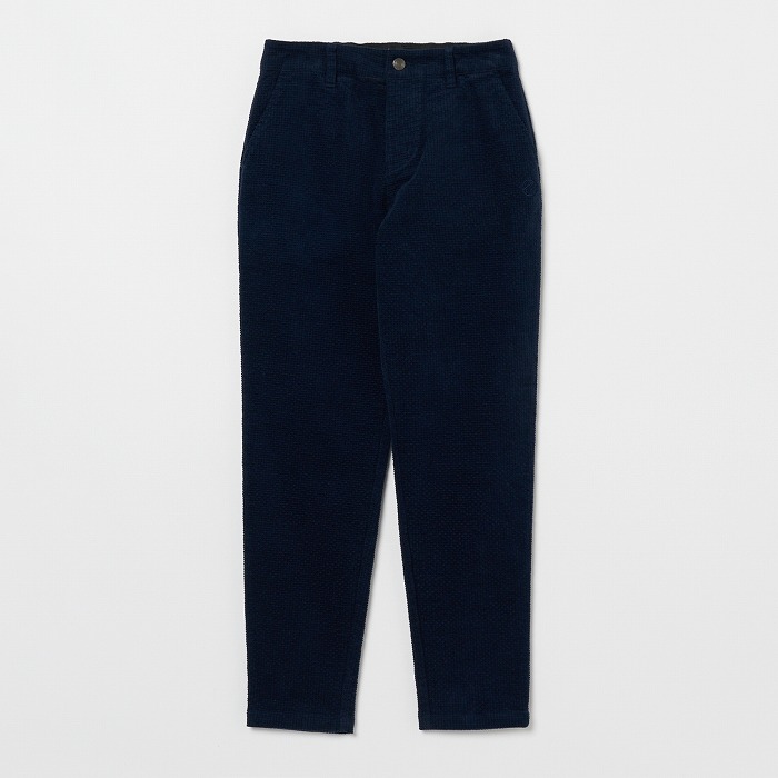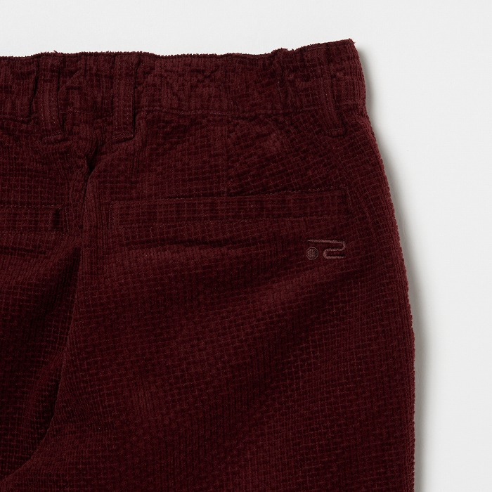 トレンド感のあるスタイリングが楽しめる、ストレッチ性のあるブロークンコーデュロイ素材を使用。後ウエスト裏は滑り止めのロゴプリントを入れたゴムを付け、屈む際シャツが出ない様に考慮した仕様がポイント。シンプルでデイリーユースにも重宝するテーパードシルエットの9分丈パンツ。