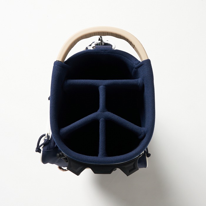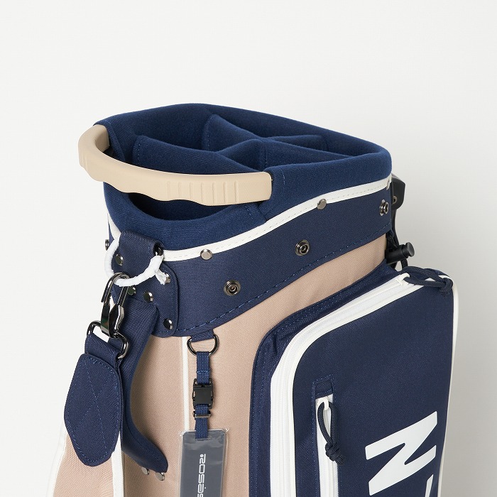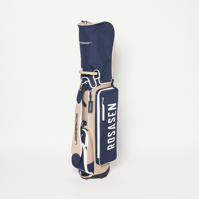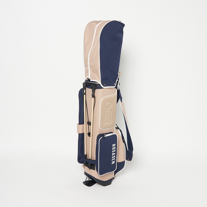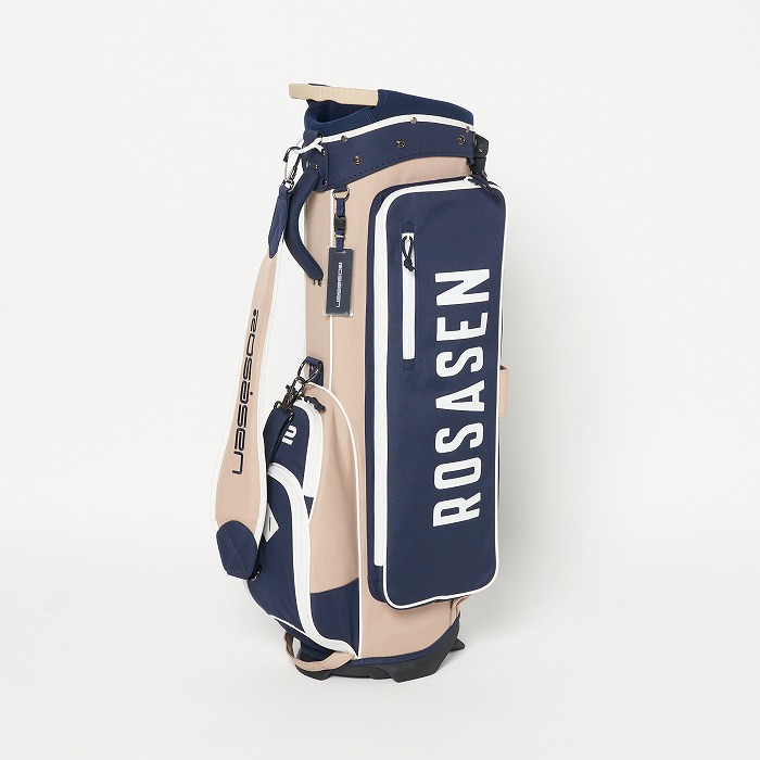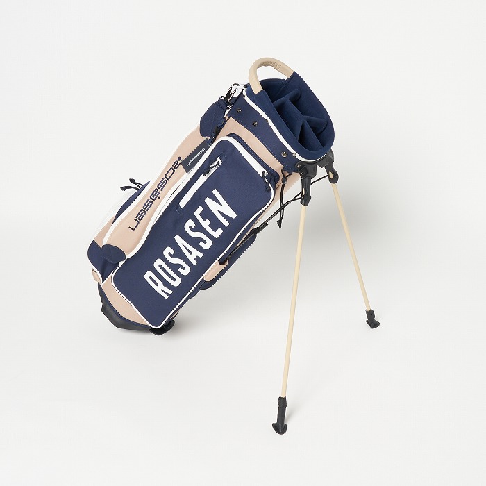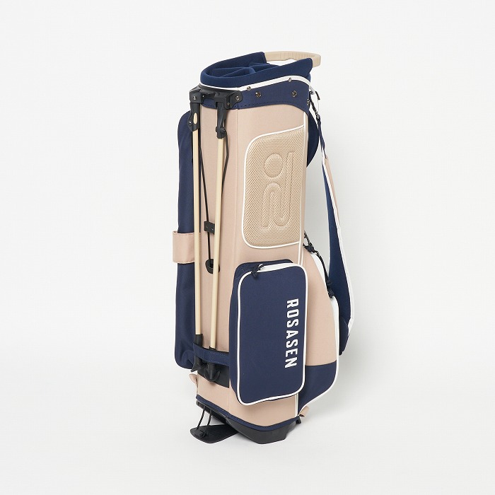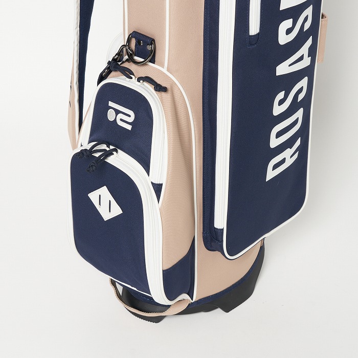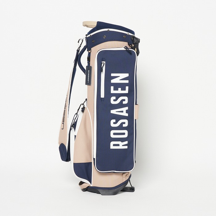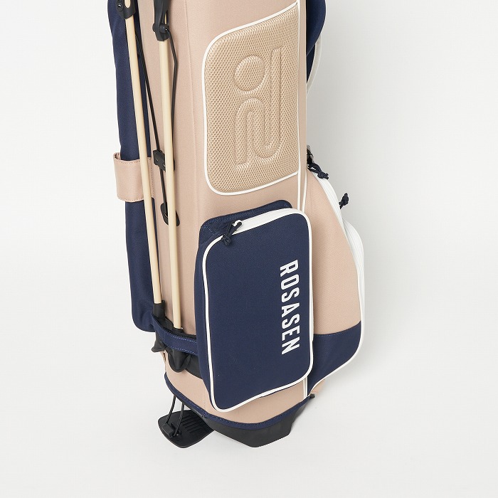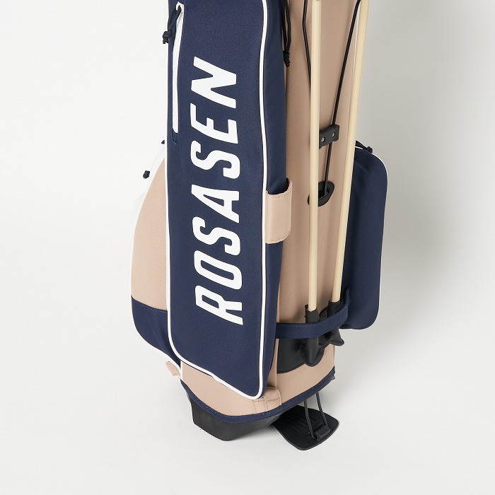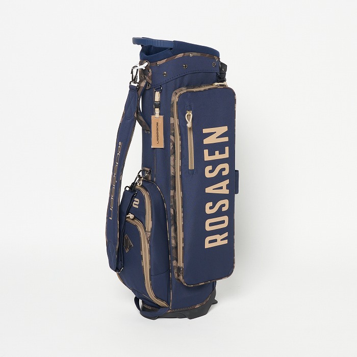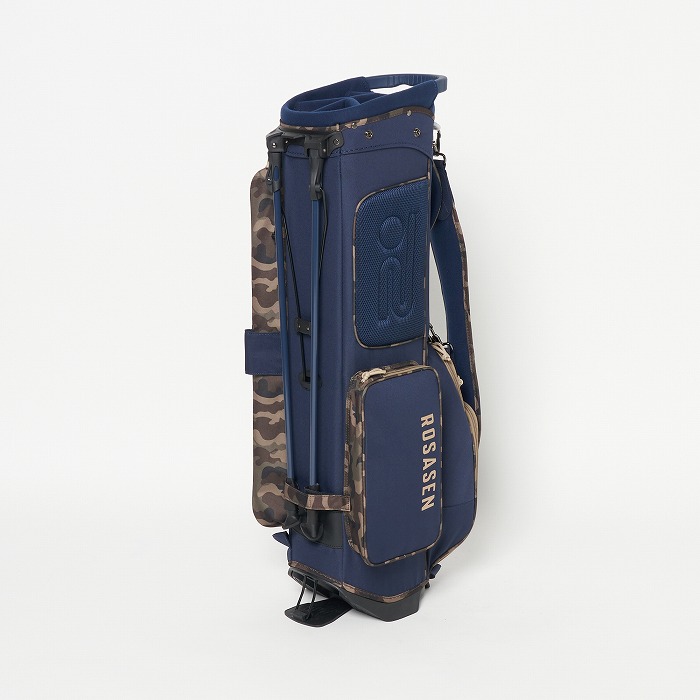 撥水機能を有する素材を使用し、カラーブロックと無地×迷彩柄を展開。要所要所に効いた配色&柄がアクセントに、サイドポケットもカジュアル感のある形にこだわった軽量のスタンドタイプキャディーバッグ。ベーシックなカラー展開ながらも配色が目を引く、ロサーセンらしい大人カジュアルなアイテム。