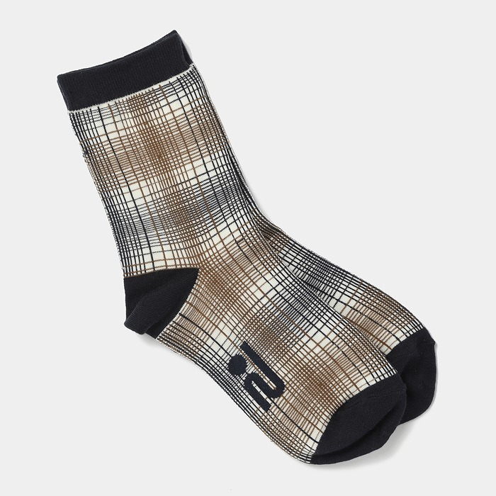 ウェアと同配色のチェック柄ソックス。シンプルなデザインながらも目を引く配色がポイント。あらゆるカジュアルコーディネートのアクセントになるアイテム。