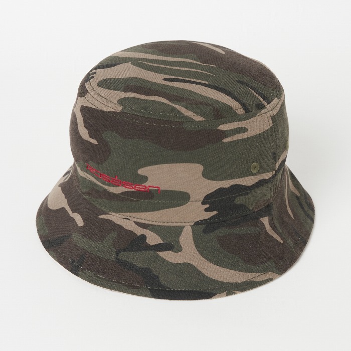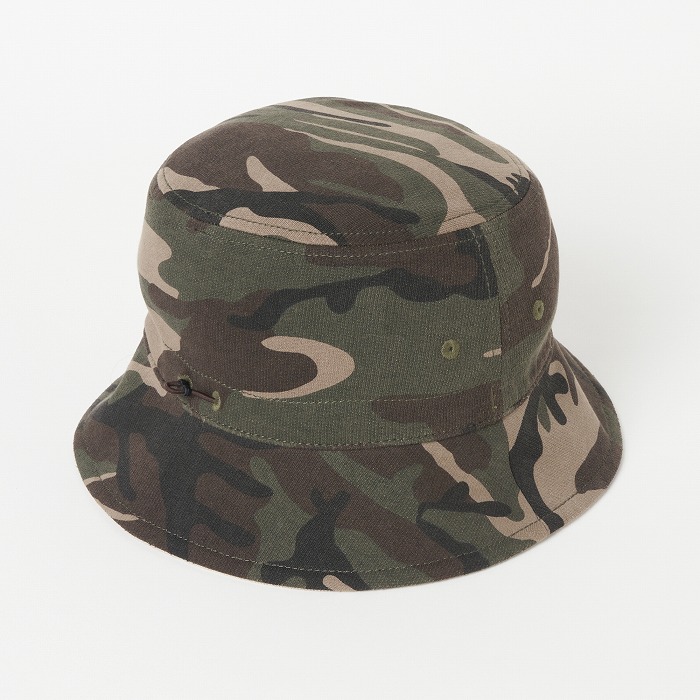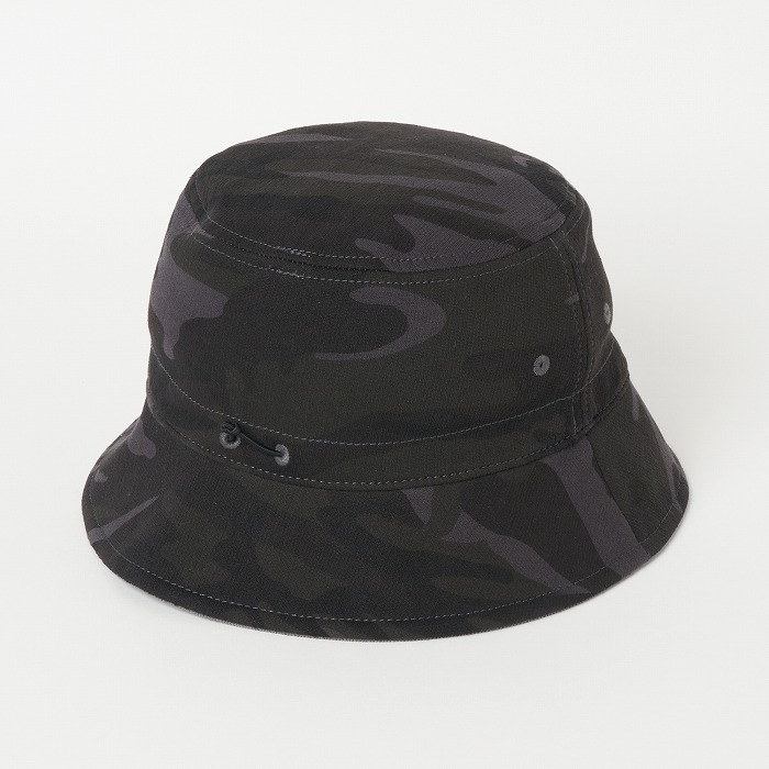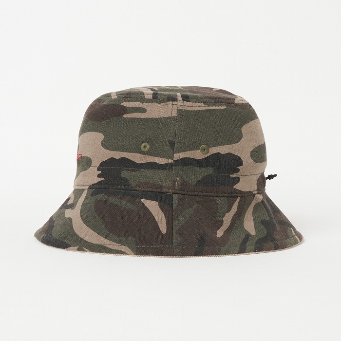 表面はポリエステルのコーデュロイを、裏面はウエアに合わせた迷彩柄のダンボールニット素材を使用したユニセックスのバケットハット。サイズアジャスター付きで、シンプルなデザインながら配色のロゴ刺繍がアクセントに。リバーシブル仕様でコーディネートに合わせ使い分けが出来、重宝するアイテム。同柄ウエアとのコーディネートもお勧め。