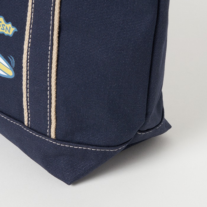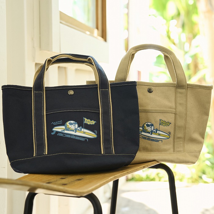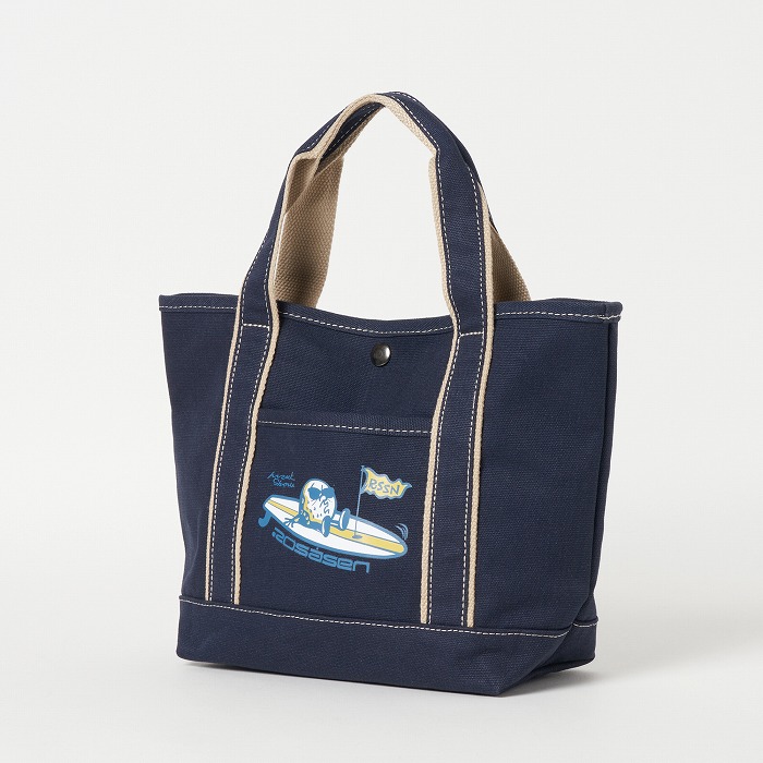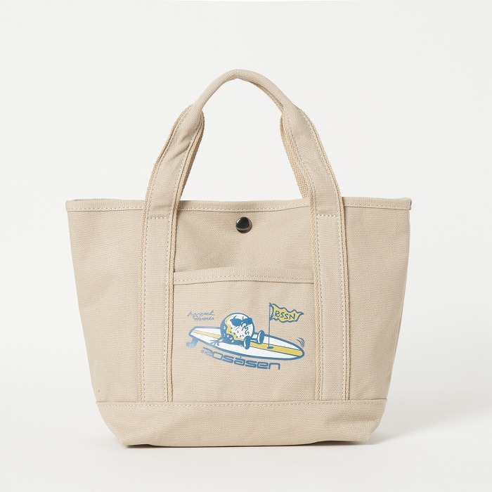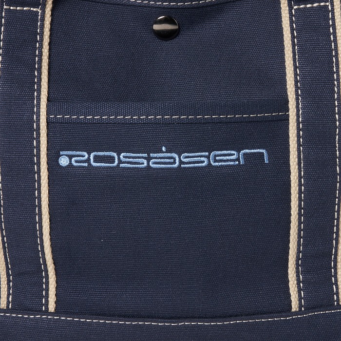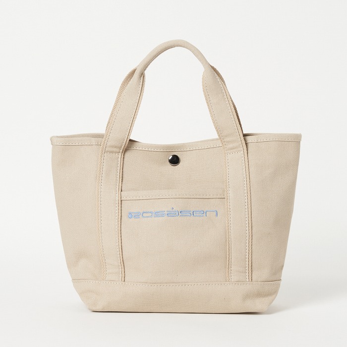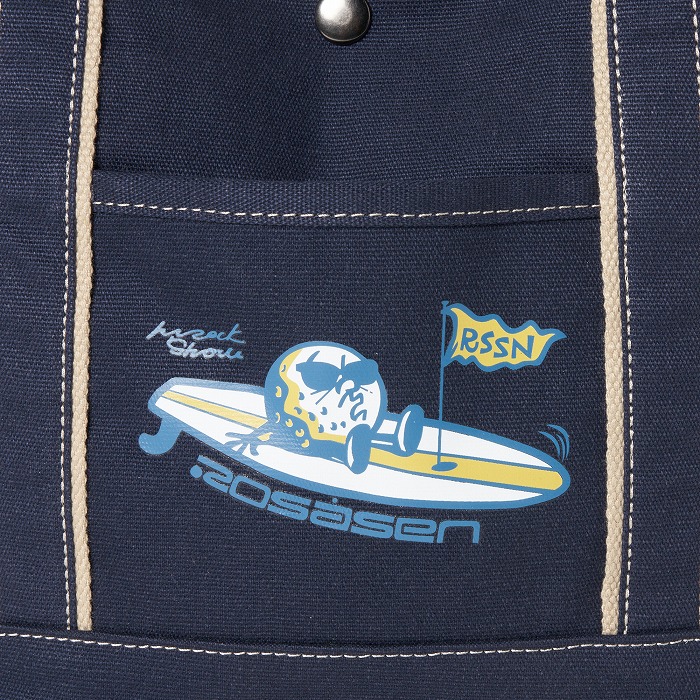 裏コーティング加工を施したキャンバス素材を使用。HIROCK SHOWさんとのコラボイラスト『ボールボーイ』入りで、両面ポケット付きのカートバッグ。口はドット釦開きで、シンプルながらもロサーセンらしい大人カジュアルなアイテム。