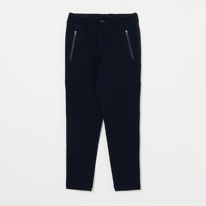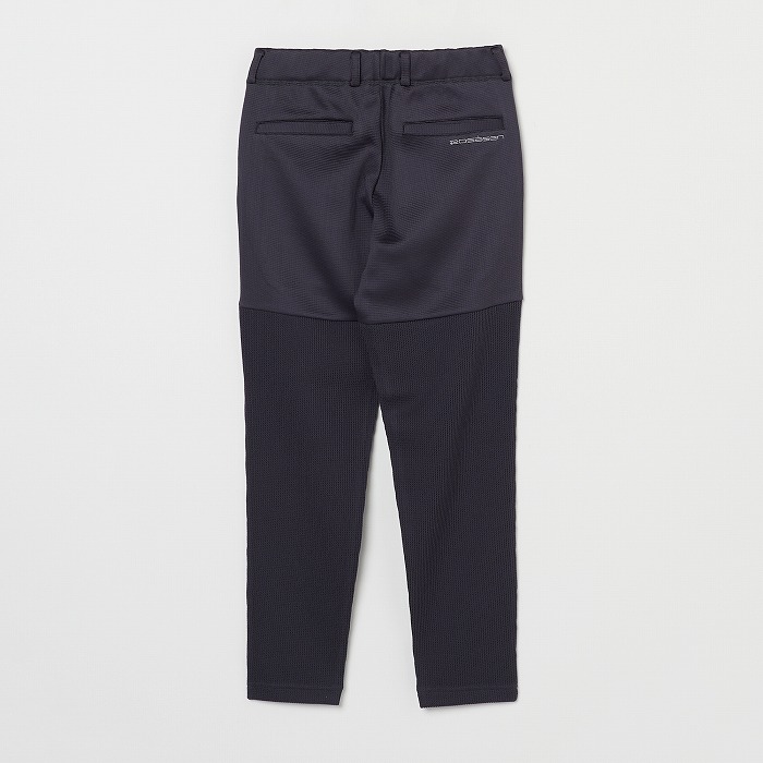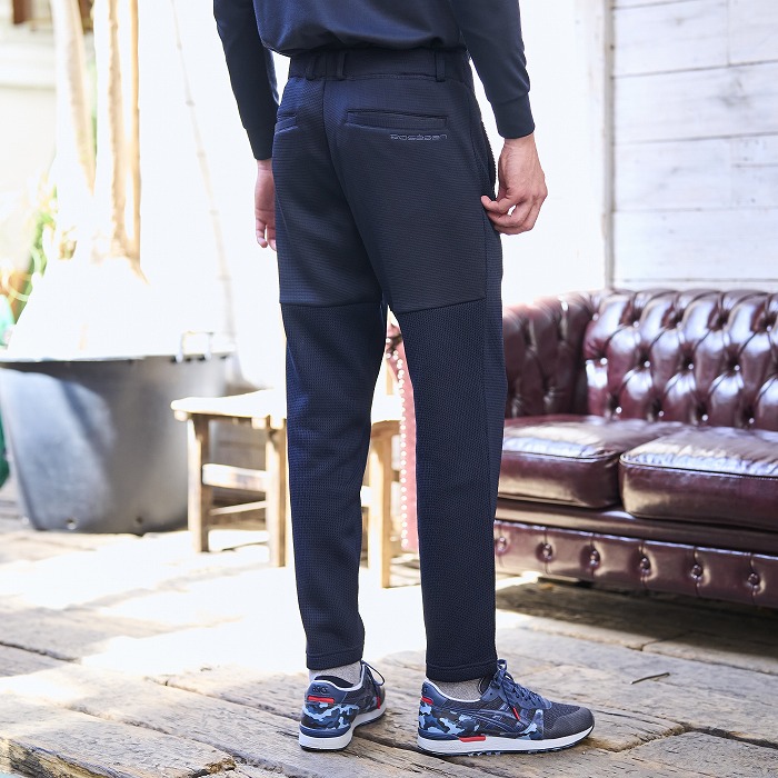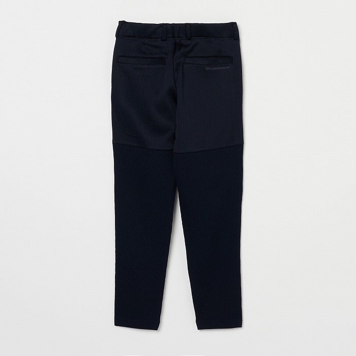 表地は8ゲージ、裏地は32ゲージの編み立てによる、こだわりの接結ジャージ素材を使用。ボンディング加工を施したような、ハリのある立体的なシルエットが特徴です。ニットのような上品な風合いながらも、軽快な着心地を実現しました。シワになりにくく、美しいフォルムをキープできるのもポイントです。さらに、カートに引っかかりにくいよう、ヒップ部分には滑らかなハイゲージ側を使用するなど、ゴルフシーンに嬉しい工夫も。