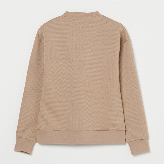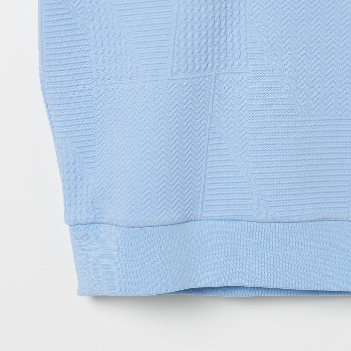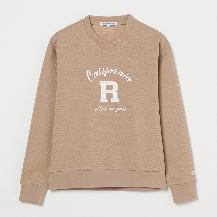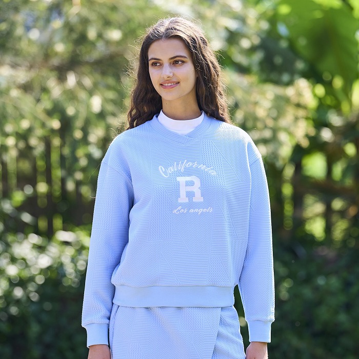 パッチワーク柄を表現した膨れジャガード素材を使用した、存在感のあるプルオーバー。表面感のある素材が、個性的でおしゃれな印象を与えます。珍しいVネックデザインが、女性らしさを引き立てます。胸元のロゴ刺繍もポイント。同素材のスカートと合わせたセットアップスタイルもおすすめです。