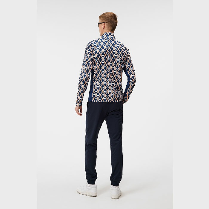 ハーフジップのミッドレイヤー。今シーズンのプリントの柄物となります。胸のシリコンブリッジ、バックネックのシリコンJ.Lindebergプリントが、デザインポイントとなります。快適さと暖かさのために内側は微起毛となっています。生地は速乾性もあり、エコテックス認定済となります。