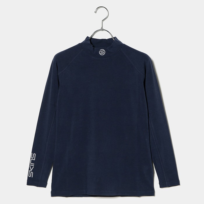 アクリル・レーヨン素材で柔らかく肌あたりの良い素材でモックネックシャツを。吸湿発熱性も兼ね備えており冬のランニングでは重宝します。衿のSマーク、右袖口のSKINSマークには再帰反射になっており、夜の視認性も確保しています。