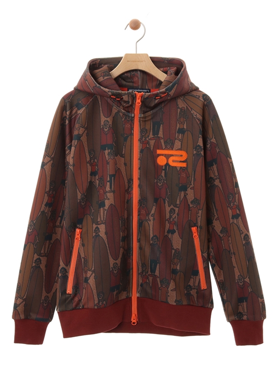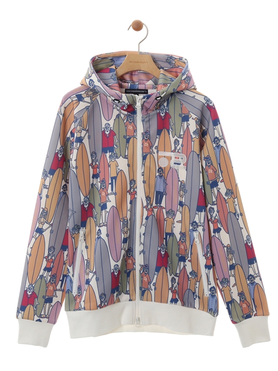 そんなルーズマンとのコラボ新作は、ルーズマンが描く総柄プリントをダンボールニットに載せたパーカー。