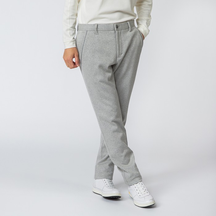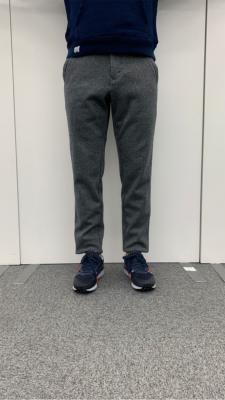 表地は起毛感が伝わらないほどしなやかで綺麗な生地感ですので、カジュアルになりすぎません。ストレッチ性に優れているので、細見のシルエットにチャレンジしました。スッキリとした見た目と履き心地の良さを実感してください。ウエストには平ゴムを入れて更に楽々。